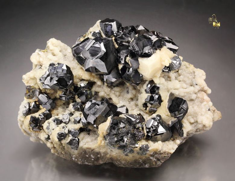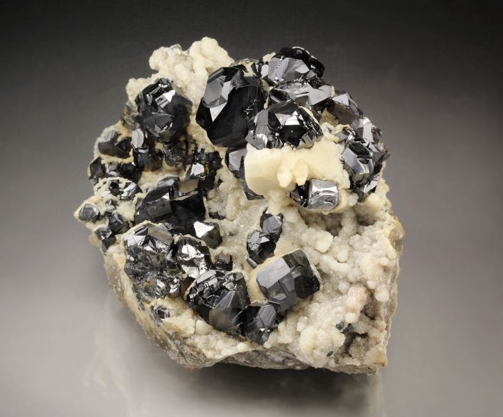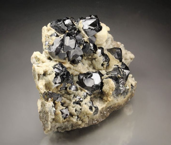 Attractive specimen of shiny twinned Sphalerite crystals with Calcite from the famous Madan ore field, Bulgaria. It displays superb crystals of black and sharp Sphalerite growing at the top of cream Calcite covered base. The Sphalerite crystals have an excellent twinning and strong luster. Small Galena crystals are seen too. In superb condition., Fantastic!Data last checked on 25th Aug 2021 - specimen may no longer be available