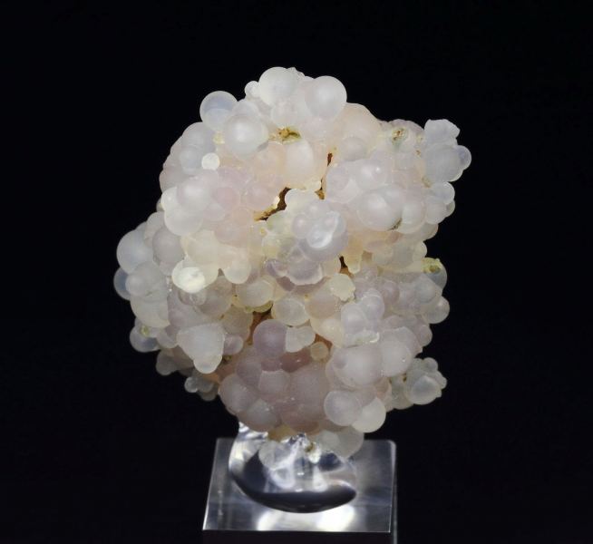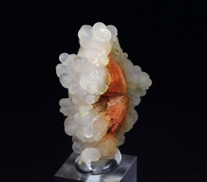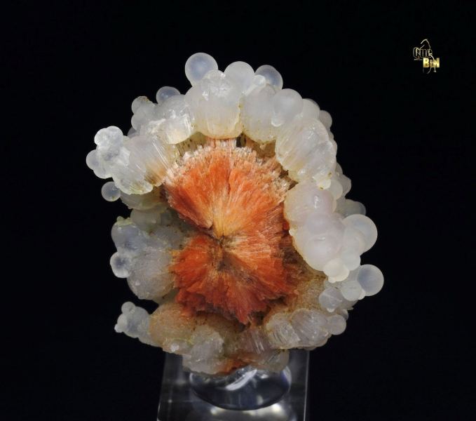 Beautiful specimen from less known locality in India - Chandanapuri, Maharashtra. It displays orange Scolecite with bursting Sun shape. It forms a spray of needle crystals. They are delicate with intense color. At the top botryoidal, colorless Chalcedony balls cover the tips of the Scolecite needles making an exquisite diadem. The specimen has very original and aesthetic 360 degree display. In excellent condition. On acrylic base., Fascinating!Data last checked on 25th Aug 2021 - specimen may no longer be available