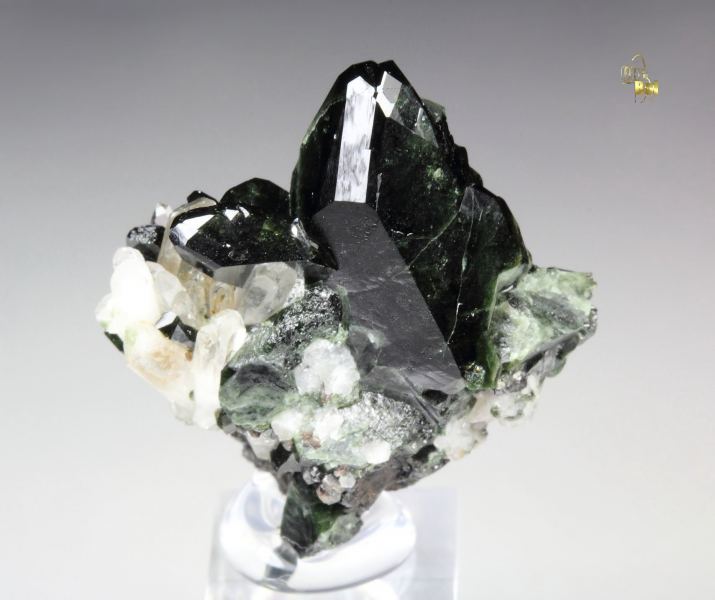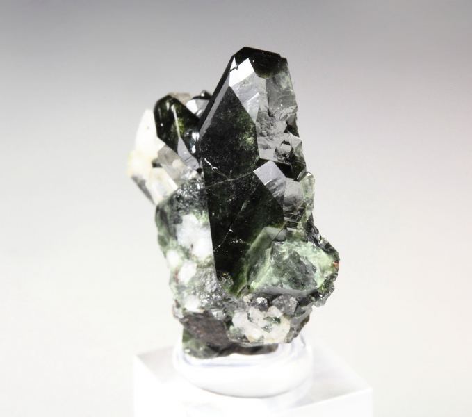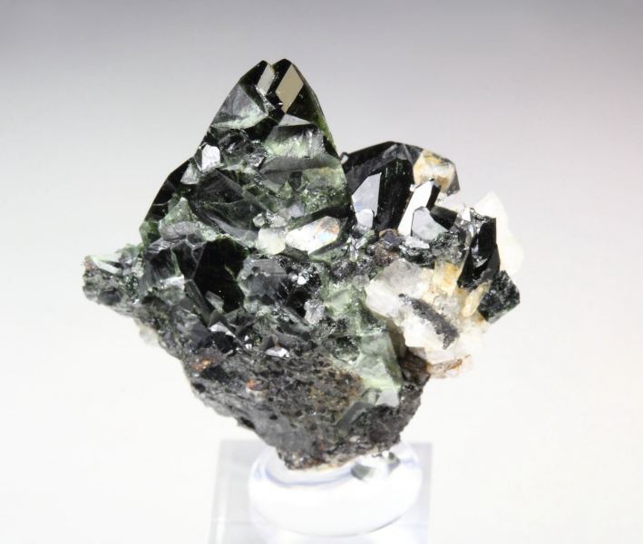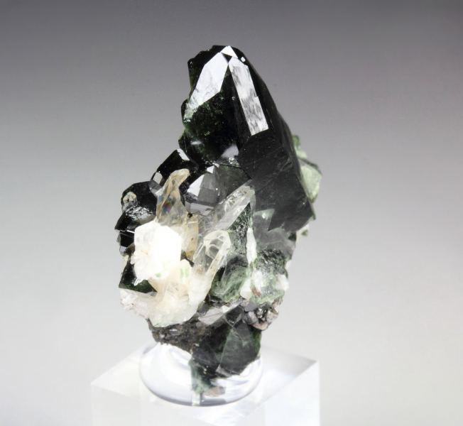 Top small specimen of outstanding Kulanite crystals and Quartz from Rapid Creek - the famous phosphate deposit of Yukon, Canada. Kulanite is very rare barium, iron, aluminum phosphate and this is the type locality. The Kulanite crystals are impressive for the species - up to 13mm. They have very dark (almost black) oil-green color and strong luster. They are well shaped and sharp. The tip of the main crystal is twinned. Small colorless Quartz crystals enrich the display. In very good condition – some small base contacts. On acrylic base., World grade quality Kulanite!Data last checked on 25th Aug 2021 - specimen may no longer be available