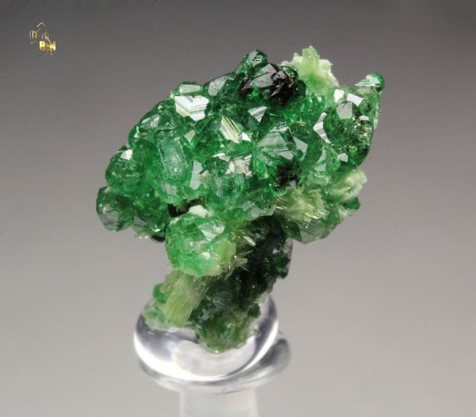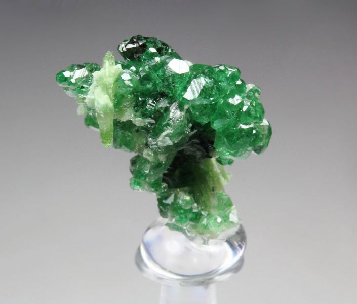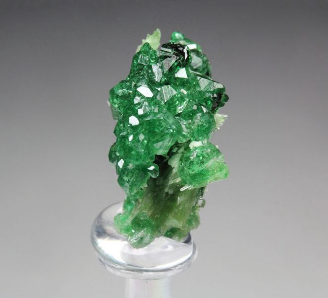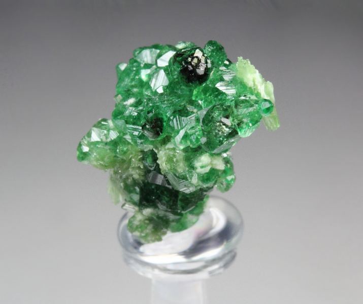Striking small specimen of Garnet var. Grossular var. Chromian with black Chromite inclusions from the famous Jeffrey mine, Quebec, Canada. The Grossular crystals are gem up to 1mm. They have deep and saturated grass-green color due to Chromium. The Garnets are with sharp rhombic dodecahedral crystallization, glassy luster and irresistible color. Some minor inclusions of black Chromite are seen too. Some apple-green Diopside crystals are seen too. Fine piece from this closed mine. It displays and sparkles attractively on both sides. For references see the 2013 issue of The Mineralogical Record vol. 44, # 4. In very good condition – some small contacts. On acrylic base., Fabulous gem-green Garnets!Data last checked on 25th Aug 2021 - specimen may no longer be available