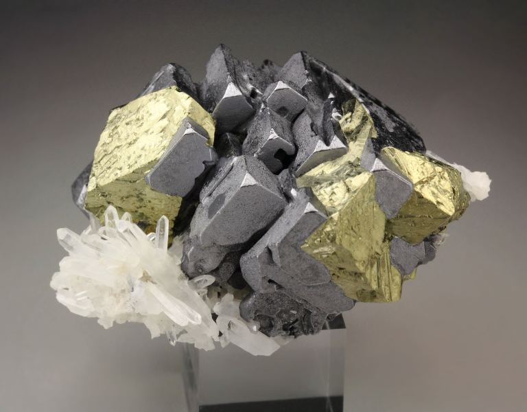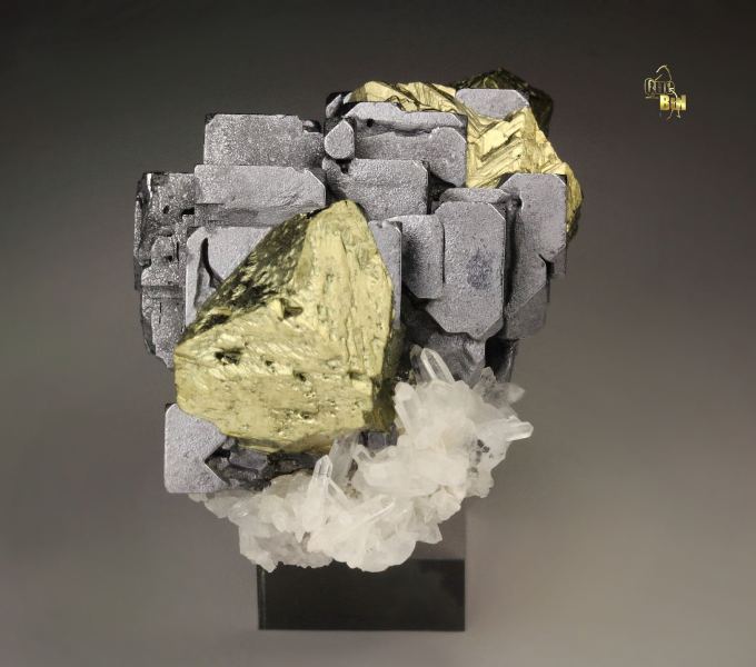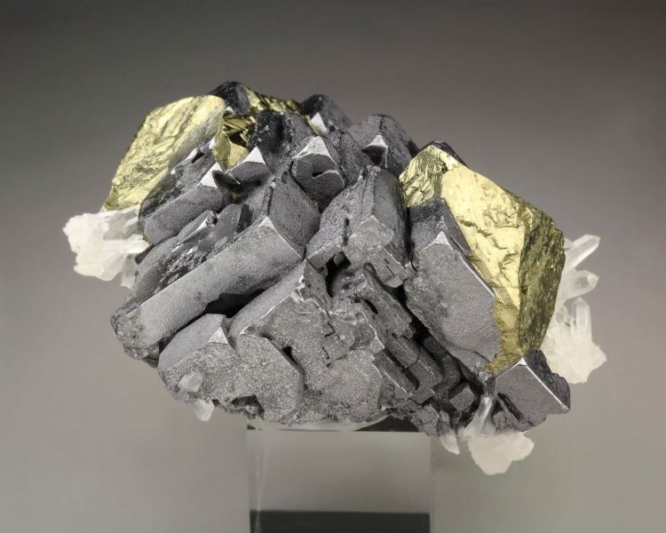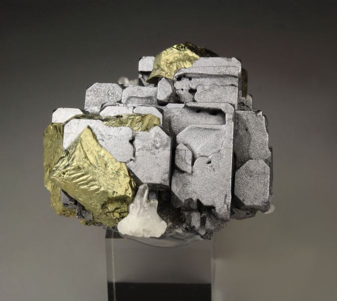 Fascinating specimen of skeletal Galena decorated attractively by Chalcopyrite from 9th Septemvri mine, Madan ore field, Bulgaria. Very neat and geometrical arrangement of stacked and aligned Galena crystals overgrowing each other. Excellent parallel growth of cubes and elongated tetragonal prisms on different axes. They grow one atop another forming amazing terraced structure. The faces are matt lustrous. Yellow Chalcopyrite crystals up to 20 mm add a nice accent. Colorless small Quartz crystals are seen too. It displays all over 360 degree. In very good condition – some small nicks and contacts. On acrylic base., Marvelous specimen from this closed mine – the only one that makes these structures!Data last checked on 25th Aug 2021 - specimen may no longer be available