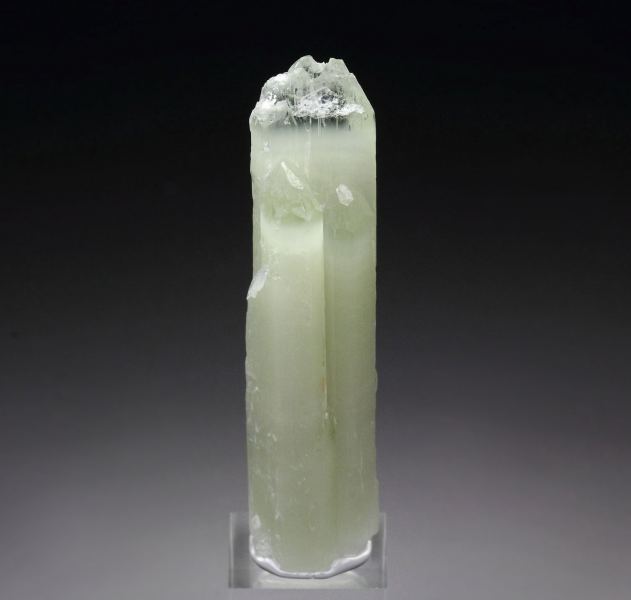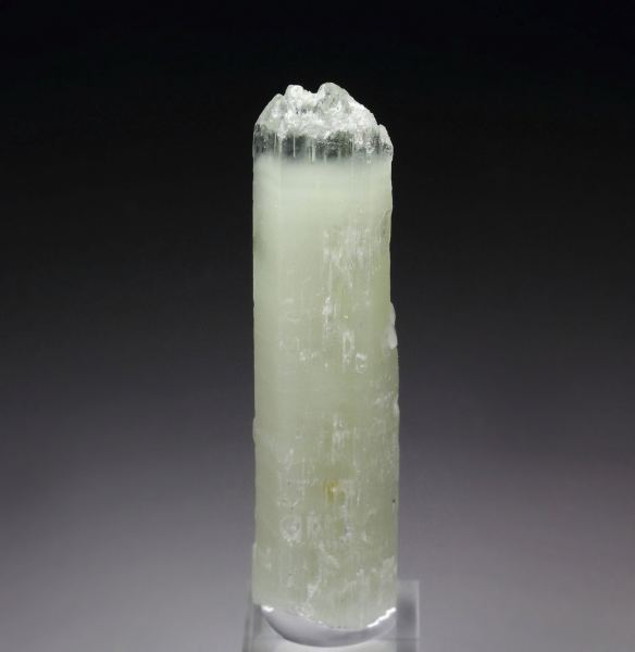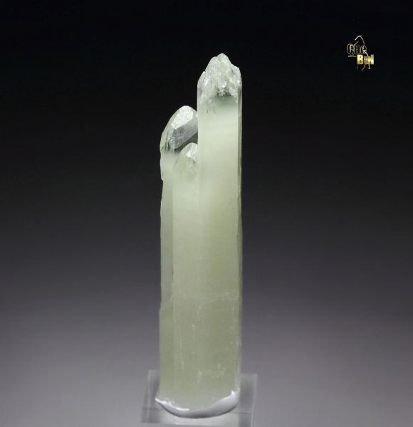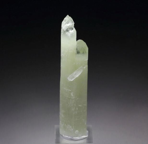 Unusual intergrowing Beryl crystals from this uncommon locality Ambatondrazaka District, Madagascar. It displays three elongated prismatic crystals. The tips are gemmy and transparent while the lower part is milky. The crystals are well shaped, strongly lustrous and sharp. They have light blue hue. It displays from all sides. In very good condition – the top crystal is terminated but it has natural imperfections. On acrylic base., Original Beryl!Data last checked on 25th Aug 2021 - specimen may no longer be available