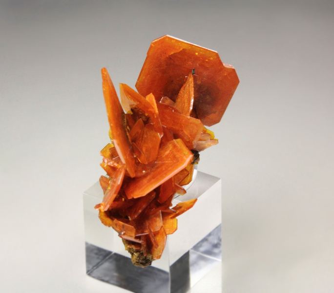 Fascinating specimen of rich orange Wulfenite crystals from Jianshan Mine, Xinjiang, China. It displays sharp, flat tabular crystals to 11mm sitting sculpturally on cluster. The crystals are lustrous and well shaped. It displays all over 360 degree. In excellent condition. On acrylic base., Beauty!Data last checked on 25th Aug 2021 - specimen may no longer be available