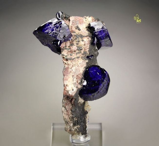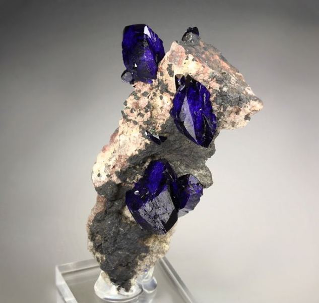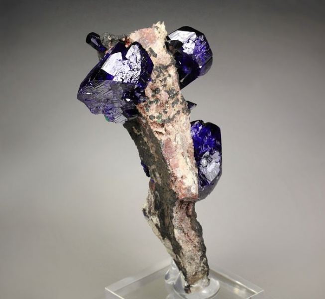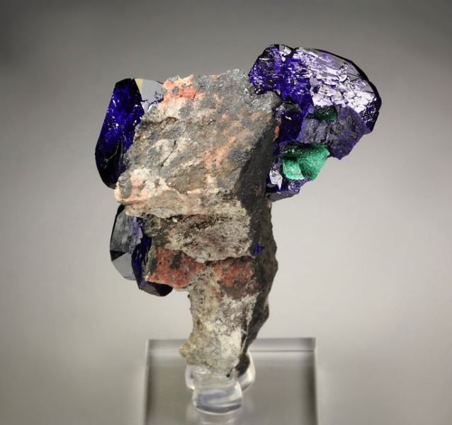 Top quality specimen of Azurite crystals beautifully growing on a base from Milpillas Mine, Mexico. It displays superb, completely terminated all over Azurite crystals. They are very well isolated and form very aesthetic and three dimensional stand with tremendous focal points. The Azurite is brilliant and extremely lustrous. The color ranges from dark blue to intense electric royal-blue. Green Malachite is seen on the back side. Displays aesthetically all over 360 degree. In superb condition. On acrylic base., Exceptional!Data last checked on 25th Aug 2021 - specimen may no longer be available