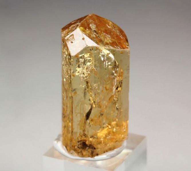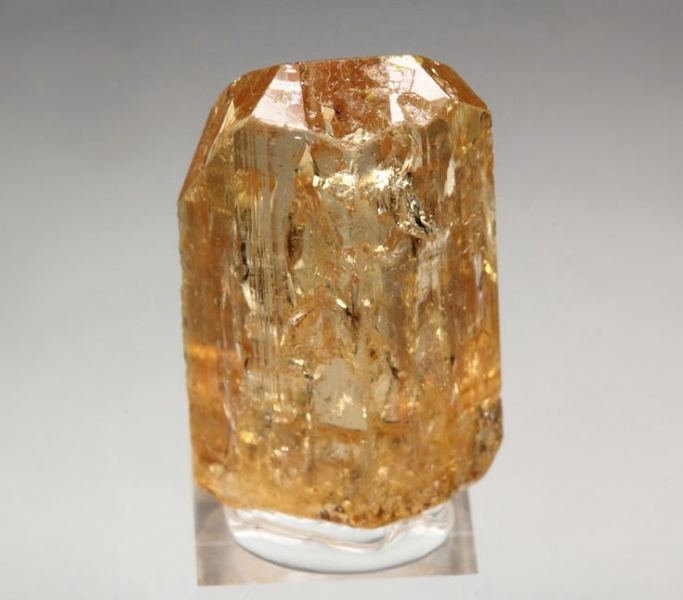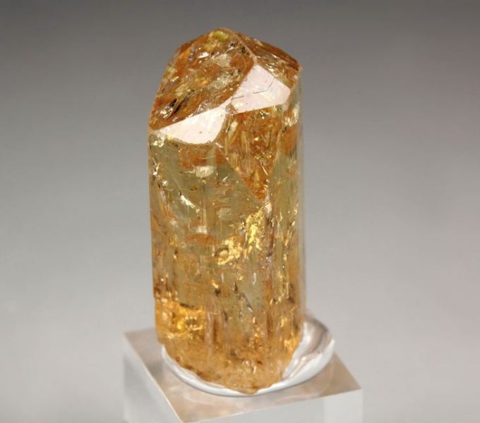 Superb 18mm gem crystal of Topaz from this less common locality - Karengerenge village, Zambia. It is 15 carats (3 grams) The crystal is var. Imperial Topaz with rich color, clear and gem. It has vivid sherry-orange color. The crystal is strongly lustrous and glassy. It is well terminated. In very good condition – some minor nicks. On acrylic base., Splendid gem!Data last checked on 25th Aug 2021 - specimen may no longer be available