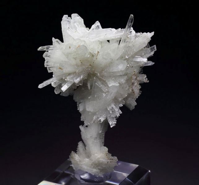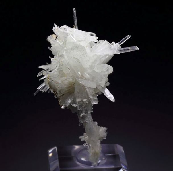 Top quality Pectolite sprays growing in exquisite and airy clusters from the famous Jeffrey mine, Quebec, Canada. The Pectolite needles are delicate and sparkling. They are white and lustrous. The specimen has aesthetic display all over 360 degree. For references see the 2013 issue of The Mineralogical Record vol. 44, # 4. In excellent condition – some small contacts. On acrylic base., Beautiful!Data last checked on 25th Aug 2021 - specimen may no longer be available