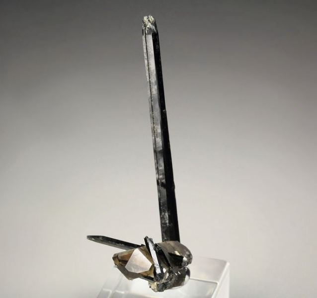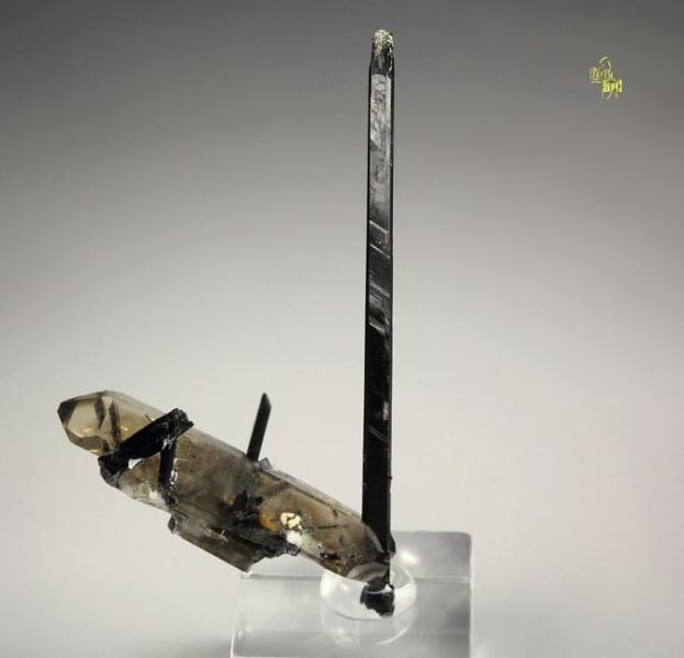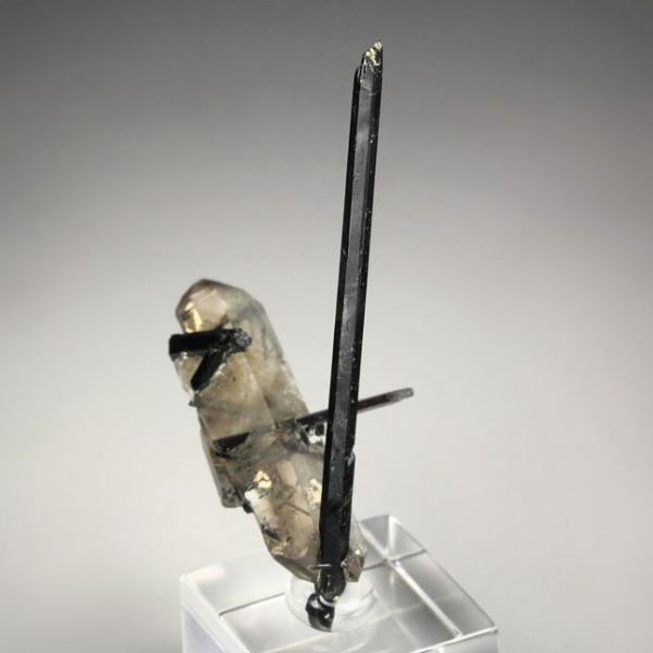 Aesthetic presentation of Smoky Quartz crystal attractively punctured by Aegirine spears from Mount Malosa, Malawi. The Aegirines are prismatic elongated crystals, black colored and lustrous. The Smoky Quartz crystal is doubly terminated, sharp, well definite, lustrous and transparent. Some small nicks and contacts. On acrylic base., Marvelous!Data last checked on 25th Aug 2021 - specimen may no longer be available