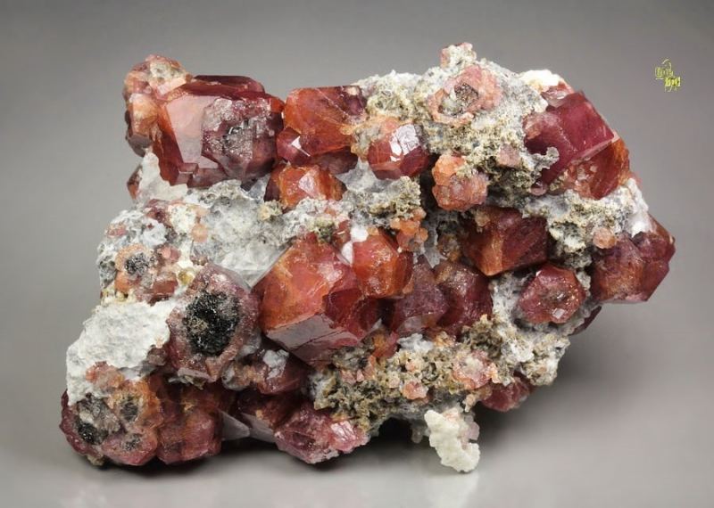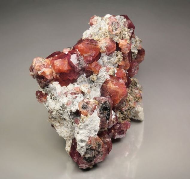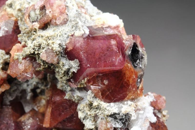 Fabulous raspberry colored Grossular Garnet crystals up to 15mm from Sierra de Cruces, Mexico. They are translucent to gemmy with strong luster. The rich and saturated raspberry color is very attractive. The cores of the crystals are black – seen only at the contact areas. The Grossular crystals have rhombic dodecahedral sharp crystallization. They sit on white matrix which underlies them very well. Some contacts., Beautiful!Data last checked on 25th Aug 2021 - specimen may no longer be available