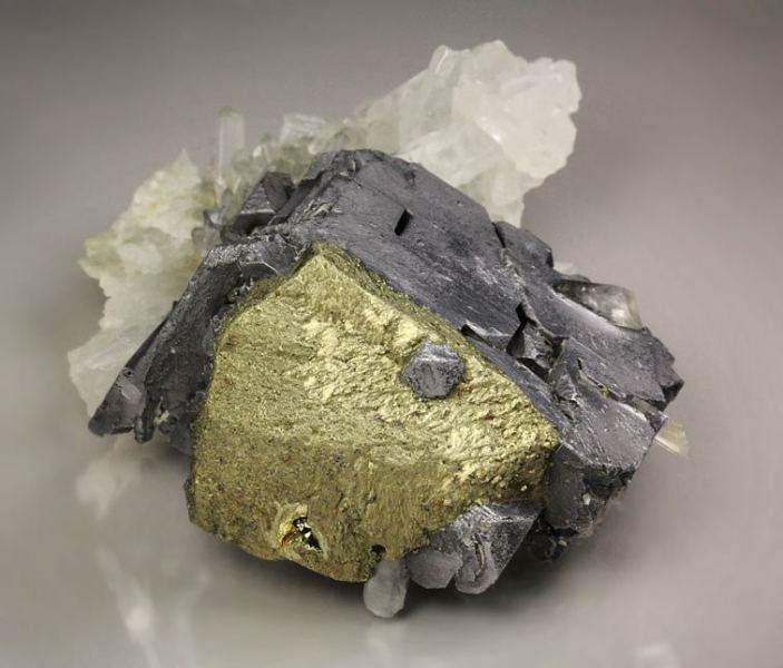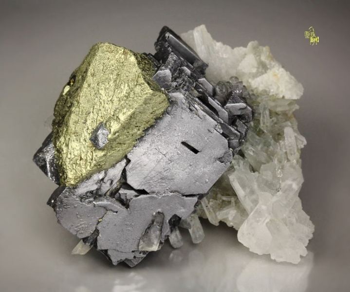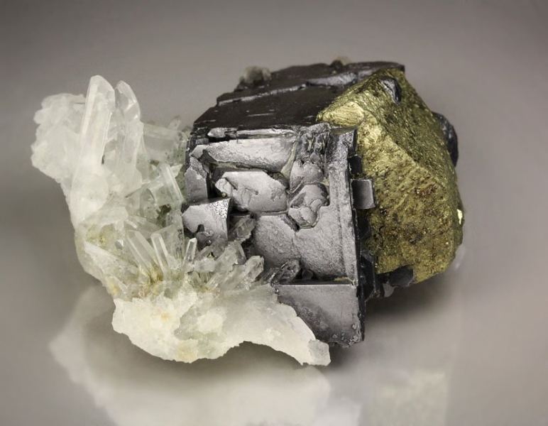 Attractive specimen displaying Chalcopyrite intergrowing with silver-metallic Galena over a Quartz druse from the famous Madan ore field, Bulgaria. The Galena penetrates in the Chalcopyrite by very neat manner. They form an excellent formation. The Chalcopyrite has yellow color and good shape. The Galena cubes are matt. In very good condition – some small damages., Fascinating!Data last checked on 25th Aug 2021 - specimen may no longer be available