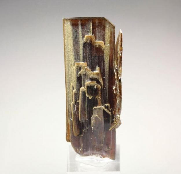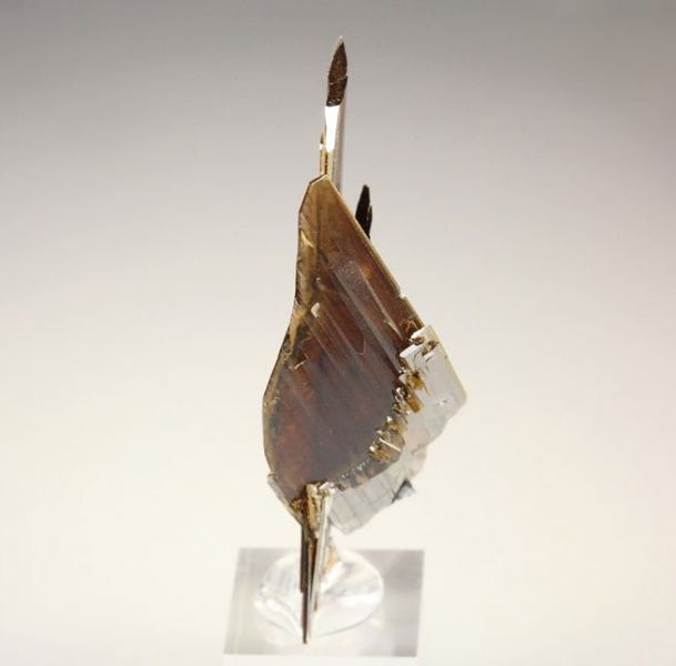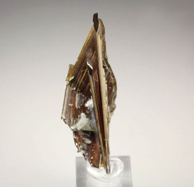Elegant specimen of Brookite crystals from Zard Mtn, Pakistan. Featuring flat prismatic Brookite crystals to 36 mm growing in a cluster. They have very elegant posture, sharp well defined blades and good luster. It displays on both sides. Some contacts. On acrylic base., Splendid!Data last checked on 25th Aug 2021 - specimen may no longer be available