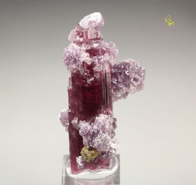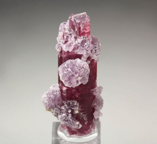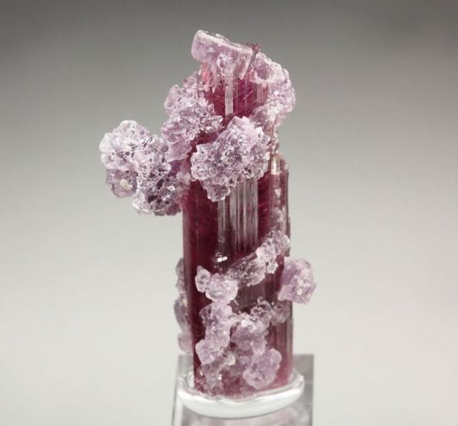 Fascinating gem Tourmaline var. Elbaite crystal with raspberry color from the famous Pederneira mine, Minas Gerais, Brazil. The crystal is 28mm long, gem and clear, with elongated prismatic shape, and excellent glassy luster. The color is rich raspberry. Above grow purple crystals of Lepidolite. The piece shows beautifully on 360 degree. In excellent condition – some minor nicks. On acrylic base., Marvelous!, Data last checked on 25th Aug 2021 - specimen may no longer be available