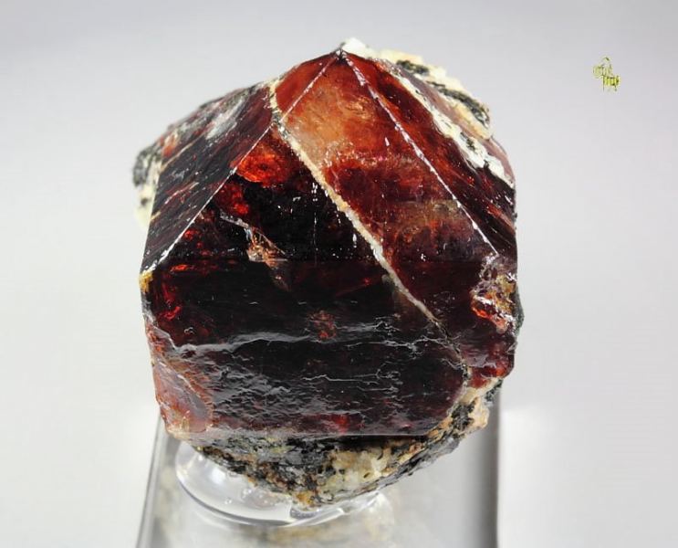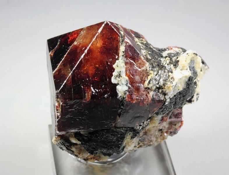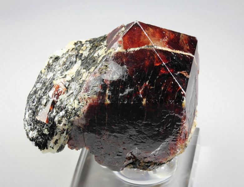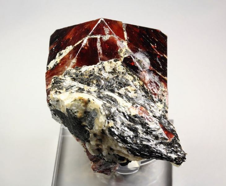 Outstanding big and gemmy Zircon crystal from Harchu, Pakistan. It is very well terminated, sharp prismatic crystals with pyramidal tip of 29mm. The Zircon has rich red to red-brown color. It is strongly vitreous and gemmy. The faces are very lustrous. Some black Biotite is seen too. Some nicks and contacts. On acrylic base., Top Zircon!Data last checked on 25th Aug 2021 - specimen may no longer be available