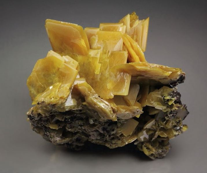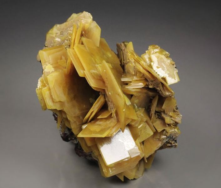 Beautiful Wulfenite specimen with very airy display from Touissit, Morocco mined in the 80s. The specimen comes from the collection of C. Mondeilh, France with a label. Features thin plates of yellow-orange Wulfenite crystals to 26mm growing attractively in a cluster. They are sharp, with pretty beveled edges, strong luster and fresh appearance. Superb quality Moroccan Wulfenite. In good condition - some damages., Gorgeous!Data last checked on 25th Aug 2021 - specimen may no longer be available
