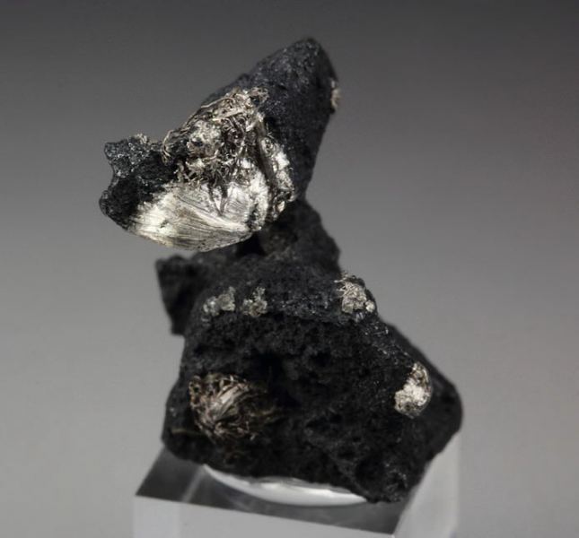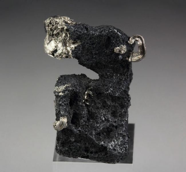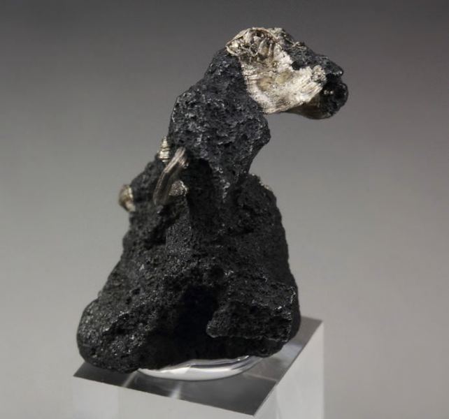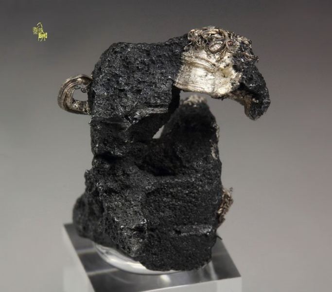 Marvelous Silver crystals over black Acanthite from Hongda Mine, Shanxi Province, China. It displays superb curved Silver crystals with good luster. The grow on well crystallized black Acanthite crystals. Very aesthetic and airy. Complete all over. In superb condition. On acrylic base., Wonderful!Data last checked on 25th Aug 2021 - specimen may no longer be available