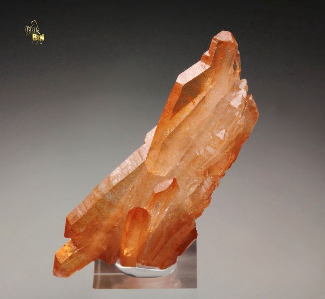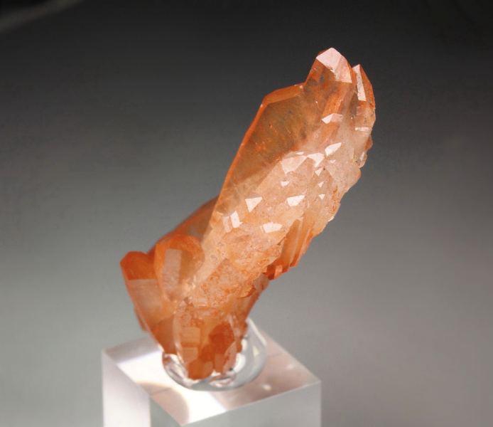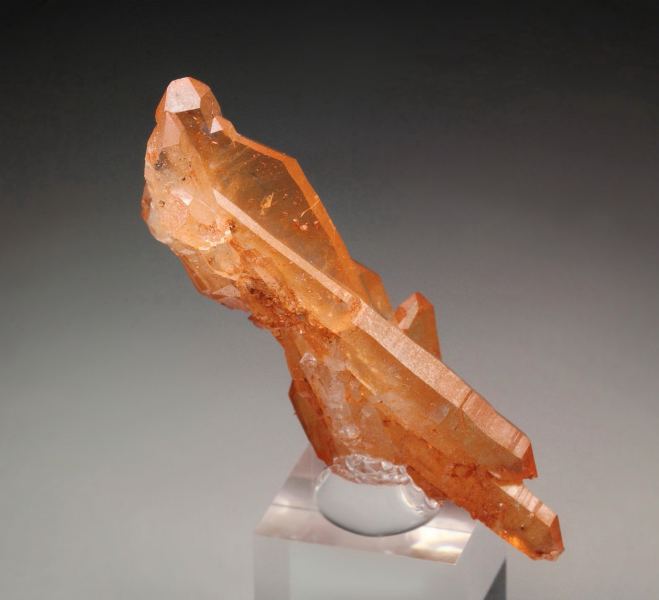 Gorgeous orange Quartz crystals from Boylston quarry, Nova Scotia, Canada. The crystals are sharp and highly lustrous, glassy, transparent and clear. They have very rich and saturated orange color due to Iron inclusions. The crystals are doubly terminated. The specimen is complete all over 360 degree and almost a complete floater. In superb condition. On acrylic base., Fantastic!Data last checked on 25th Aug 2021 - specimen may no longer be available