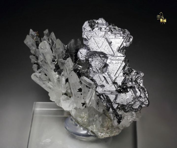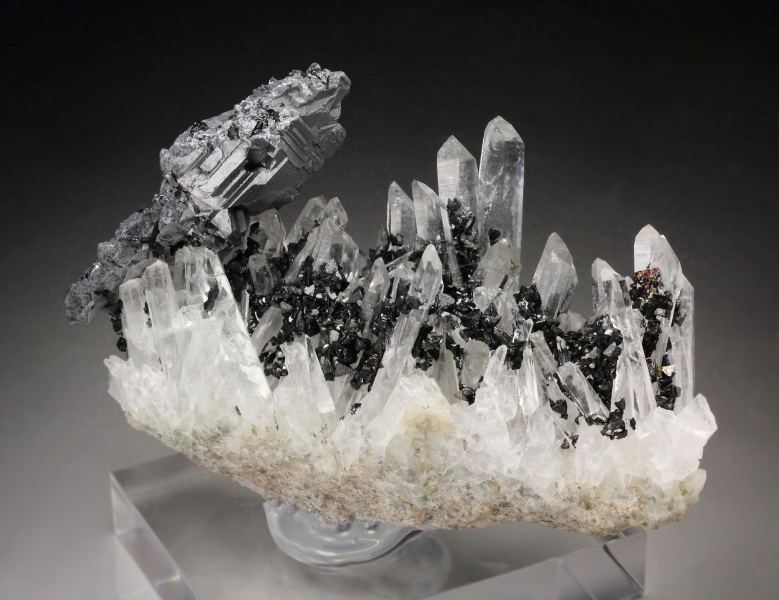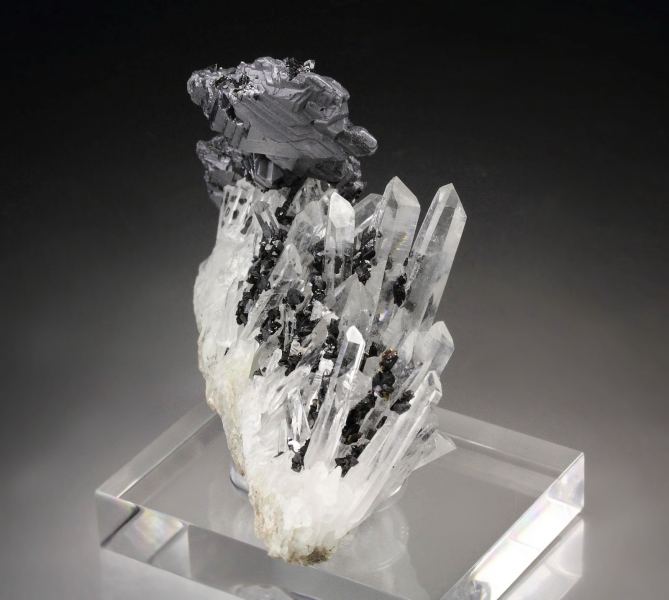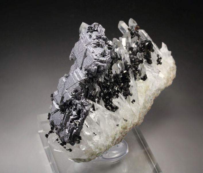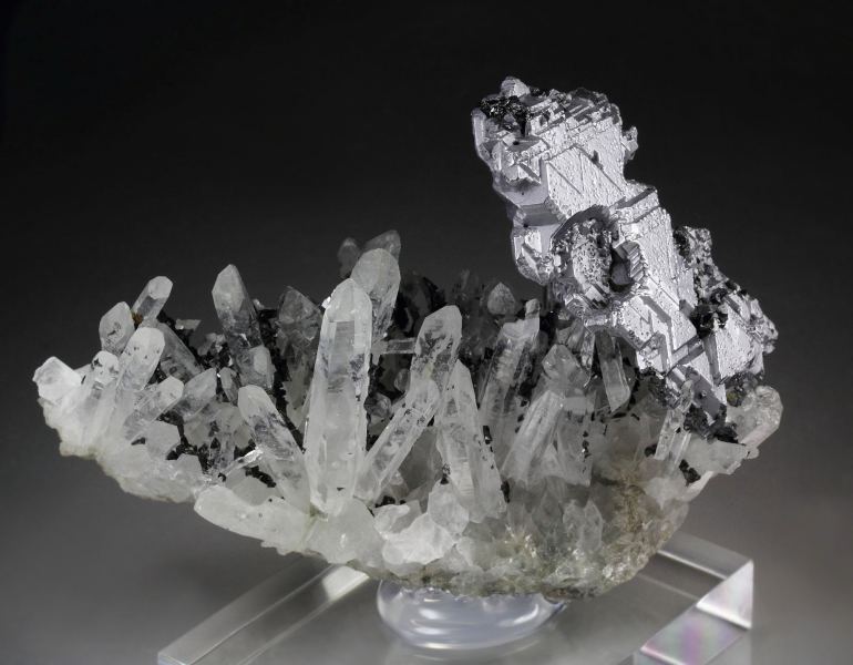 Beautiful specimen of silvery metallic Spinel Law twin Galena decorating Quartz and Sphalerite base from the famous Madan ore field, Bulgaria. It displays Galena twins with rounded edges and matt luster. The spinel twins are staggered one atop another and they form a flat plate sitting sculpturally over the Quartz druse. The elegant elongated Quartz crystals give beautiful spiky finish. They are transparent and water clear with sharp shape. Black Sphalerites tetrahedrons are sprinkled on the Quartz. It displays aesthetically all over 360 degree. In good condition – some base part contacts and damages. On acrylic base., Fabulous!Data last checked on 25th Aug 2021 - specimen may no longer be available