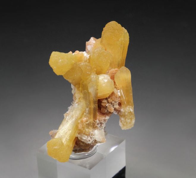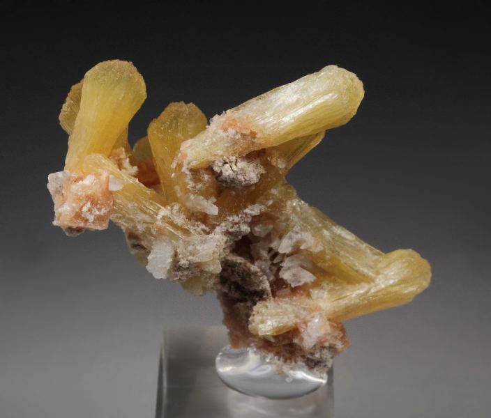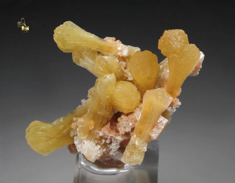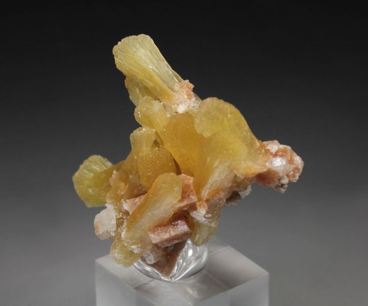 Exquisite specimen of fan-shaped Stilbite sprays decorated with Chabazite and minor Heulandite from Wasson Bluff, Nova Scotia, Canada. The Stilbite forms graceful half bow ties. They are fresh and lustrous with orange color. The Chabazite crystals have cubic habit with light salmon-pink color. Small sparkling colorless Heulandite crystals are seen too. In excellent condition – some small contacts. On acrylic base., Beautiful!Data last checked on 25th Aug 2021 - specimen may no longer be available