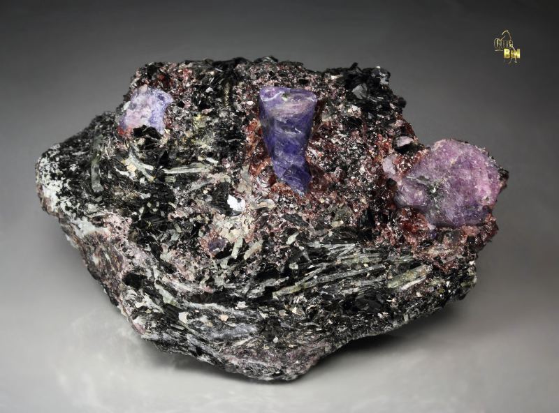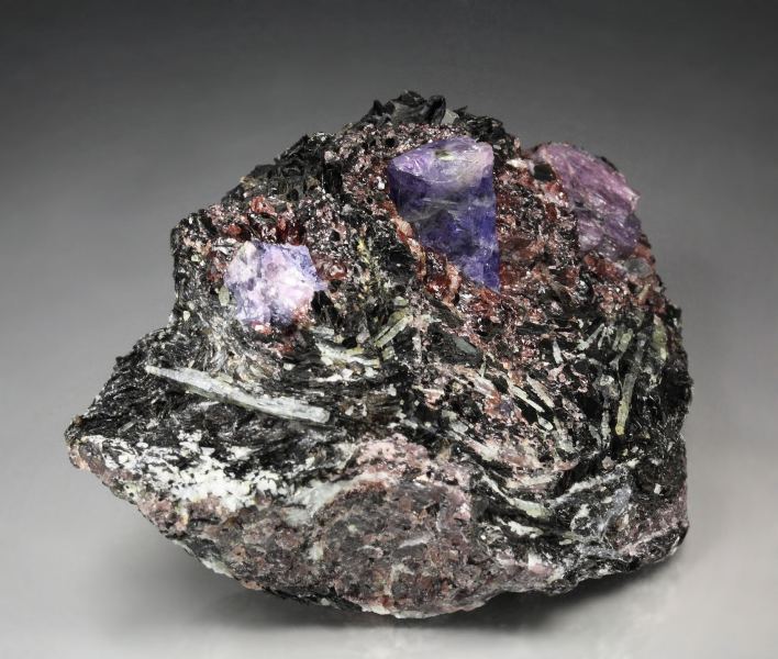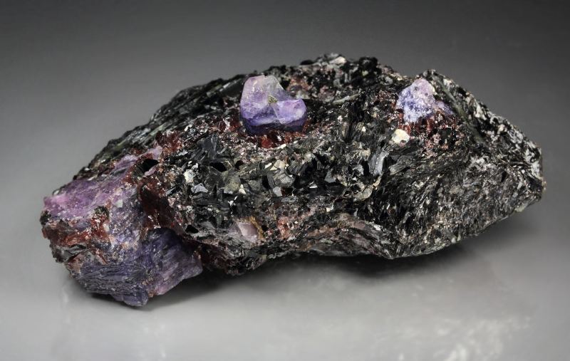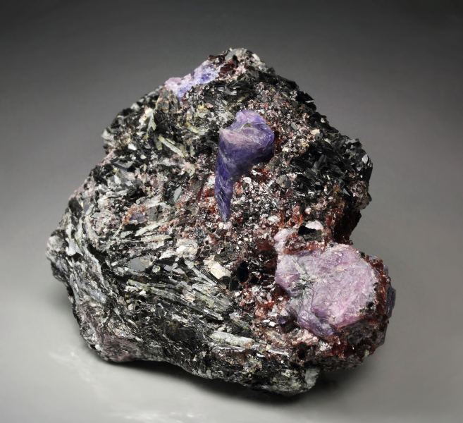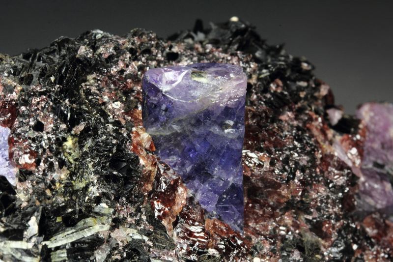 Colorful bi-color Corundum var. Ruby crystals on a pegmatite base with black Muscovite and Pyrope var. Rhodolite from Zazafotsy Quarry, Fianarantsoa Province, Madagascar. The Corundum crystals up to 19mm have rich color variations from purple to violet. They are hexagonal crystals with flat terminations. The luster is strong and the crystals are slightly translucent. Red Pyrope var. Rhodolite grows around the Ruby. Some unidentified elongated prismatic crystals are seen too. Some natural imperfections and damages., Marvelous!Data last checked on 25th Aug 2021 - specimen may no longer be available