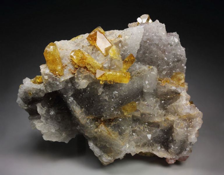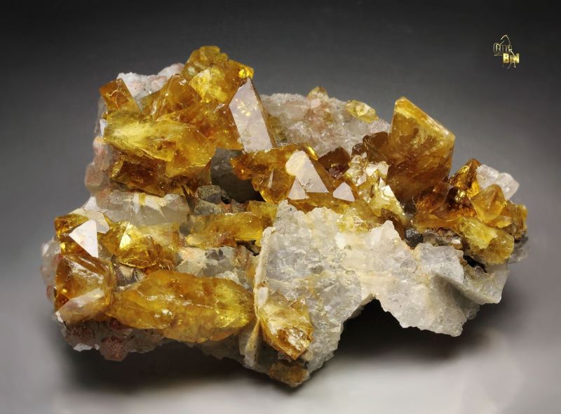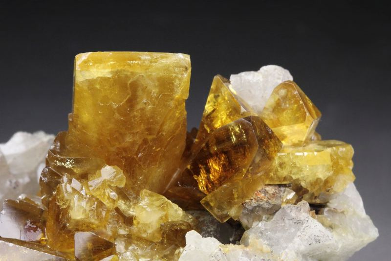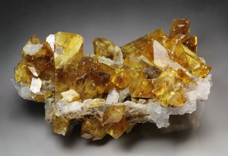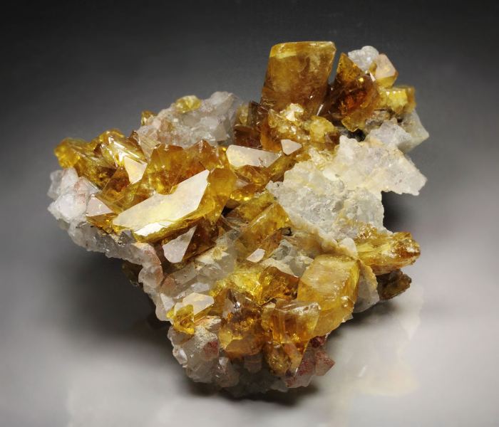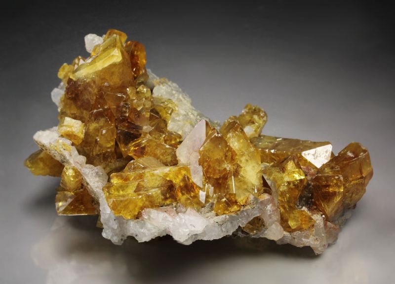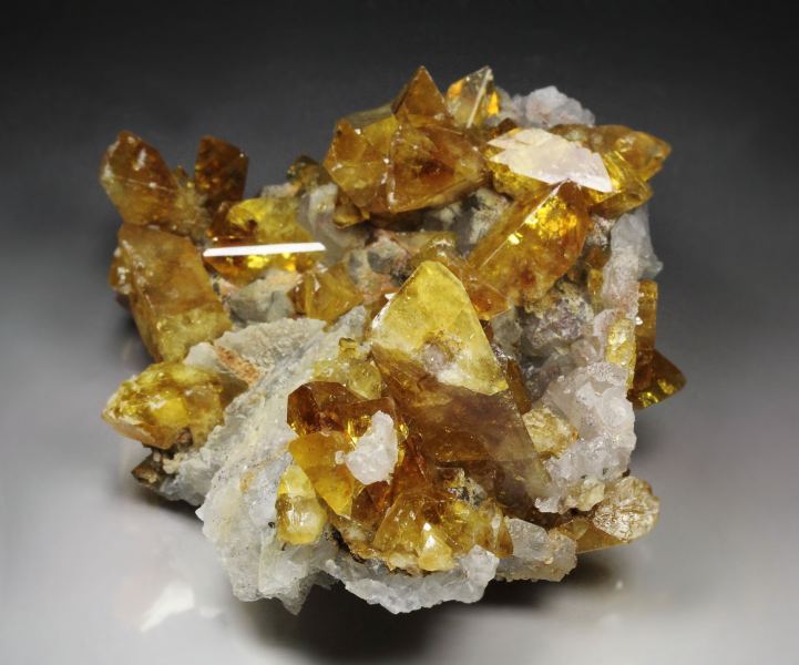 Outstanding specimen of gem Baryte from this famous Saxon locality - Pohla, Germany. It displays beautiful clusters of intergrowing crystals on a Quartz crust. The color of the Baryte is simply amazing – golden amber, very saturated and striking. The Barytes crystals are very sharp and well shaped, extremely lustrous, completely transparent and gem. Some crystals are doubly terminated. The chunky Quartz crystals base has cubical cast shape due to unidentified crystals which have been dissolved. It shows attractively on both sides. In good condition – some small damages., The golden Barytes from Pohla set the world standard and this is a gorgeous specimen!Data last checked on 25th Aug 2021 - specimen may no longer be available