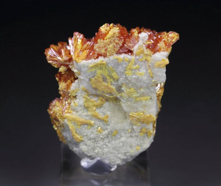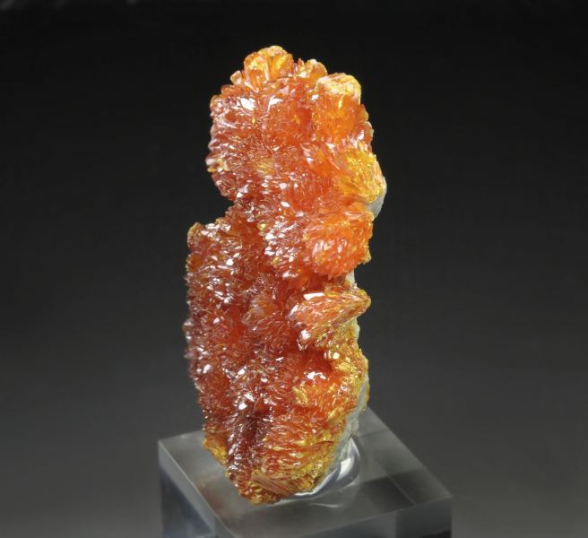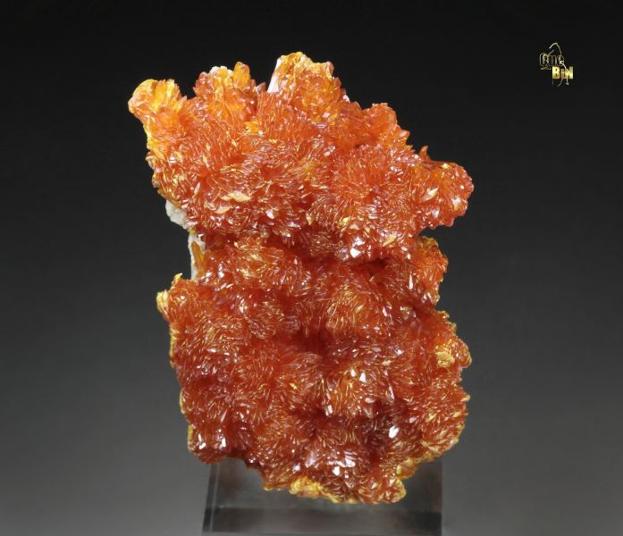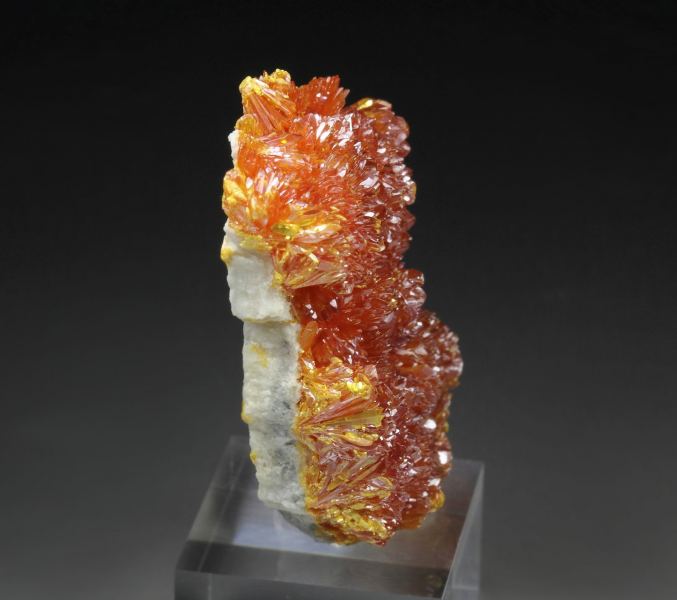 Colorful orange Orpiment specimen from Russia mined more than 14 years ago. It comes from 2004 find in El brusskiy Arsenic mine, Elbrus Mt, Russia. The Orpiment crystals are blades forming dense fan clusters. The specimen is fresh and sparkling. The color is very saturated, vivid and intense orange, which is simply marvelous. In order to preserved the color the specimen must be stored in a dark and not exposed on a sun light. In good condition – some small bruises. On acrylic base., Striking!Data last checked on 25th Aug 2021 - specimen may no longer be available