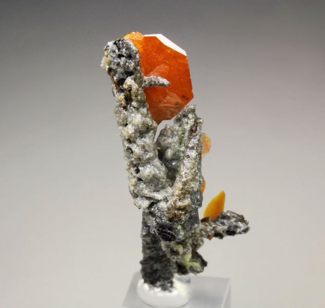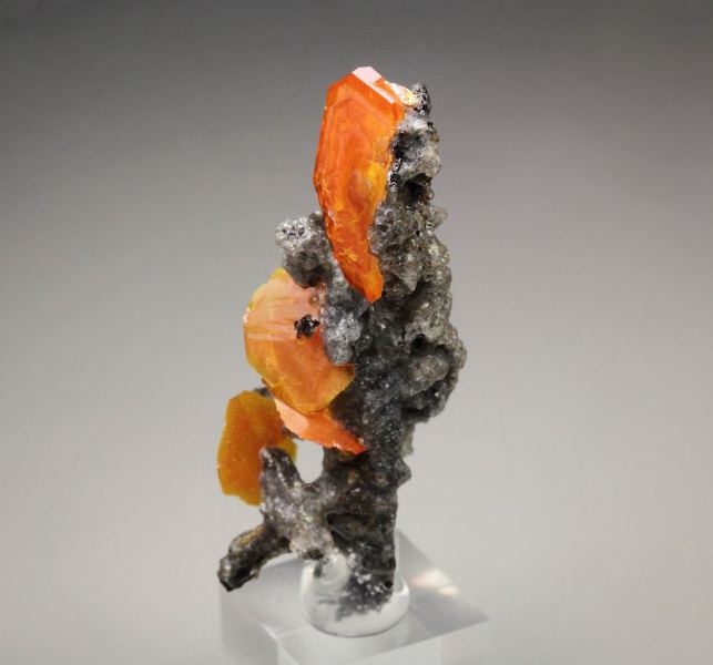 Beautiful specimen of rich orange-red Wulfenite crystals from Jianshan Mine, Xinjiang, China. It displays sharp, flat tabular crystals to 12mm sitting sculpturally on a stalactite like base. The crystals are from lustrous to more matt. It displays all over 360 degree. In excellent condition – some minor nicks. On acrylic base., Fabulous!Data last checked on 25th Aug 2021 - specimen may no longer be available