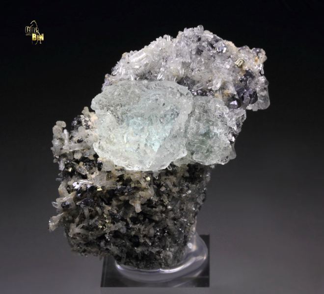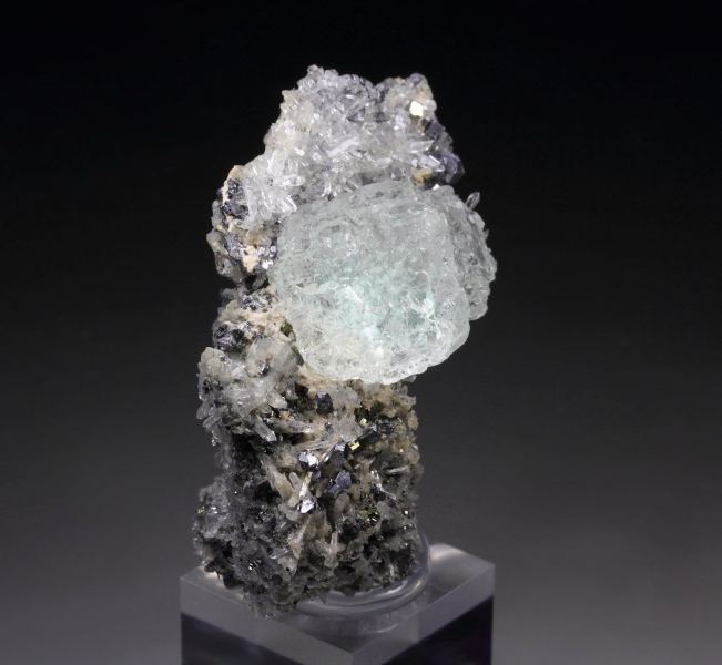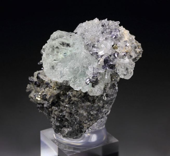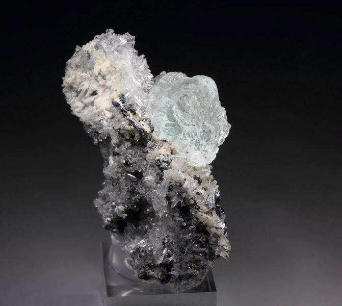 Splendid specimen displaying cubic Fluorite crystals sitting attractively on Quartz covered base from Huancavelica, Peru. The Fluorite crystals are well shaped with pleasant light green color, strong luster and transparent. The Quartz crystals are sparkling and decorated with small Galena and Pyrite crystals. In excellent condition . On acrylic base., Pretty!Data last checked on 25th Aug 2021 - specimen may no longer be available