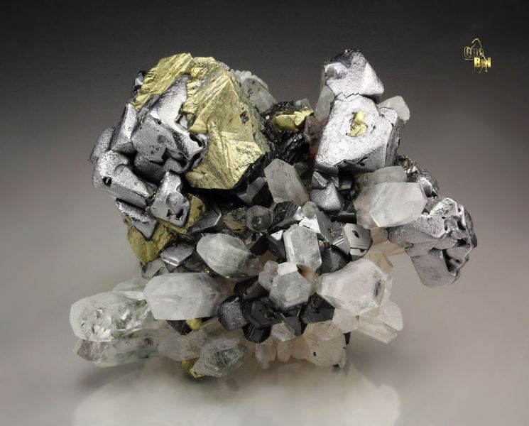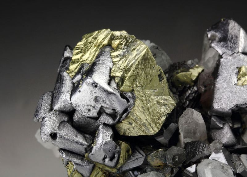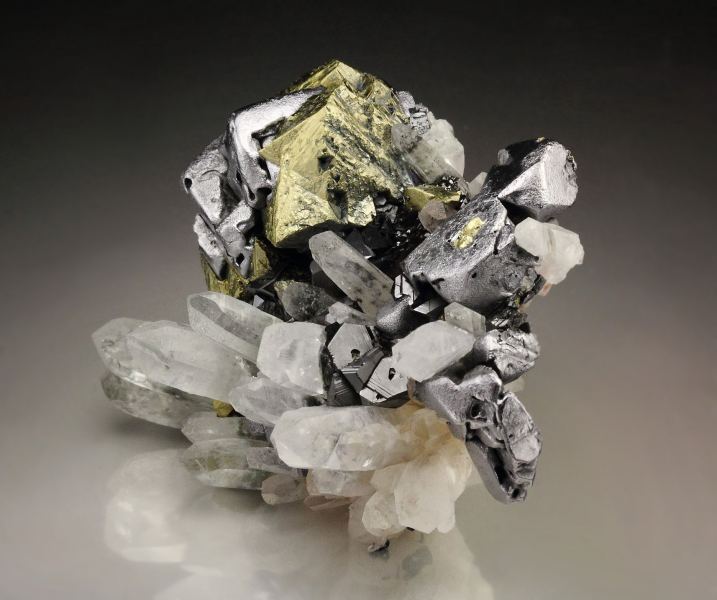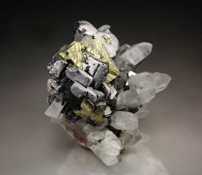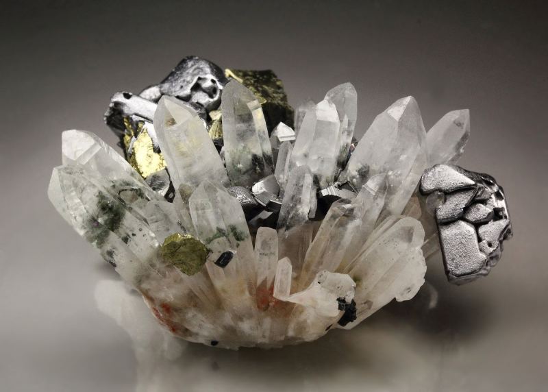 Beautiful specimen of skeletal Galena and Chalcopyrite decorating attractively radial Quartz spray from 9th Septemvri mine, Madan ore field, Bulgaria. It displays very neat and geometrical arrangement of stacked and aligned Galena crystals overgrowing each other. Excellent parallel growth of cubes and elongated tetragonal prisms on different axes. They grow one atop another forming amazing terraced structures. Some cavernous formations are seen on the Galena. The faces are matt lustrous. Yellow Chalcopyrite crystals up to 24 mm add a nice accent. Black Sphalerite crystals with strong luster grow among the Quartz. The Quartz crystals are sharp, chunky, transparent and clear. They have green Chlorite inclusions. In excellent condition., Fascinating specimen from this closed mine – the only one that makes these structures!Data last checked on 25th Aug 2021 - specimen may no longer be available