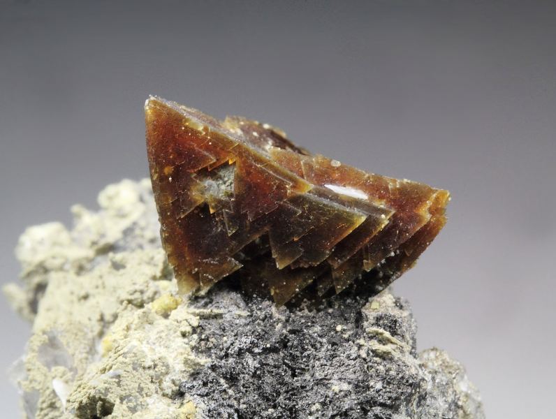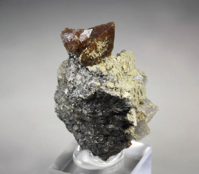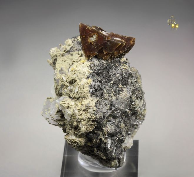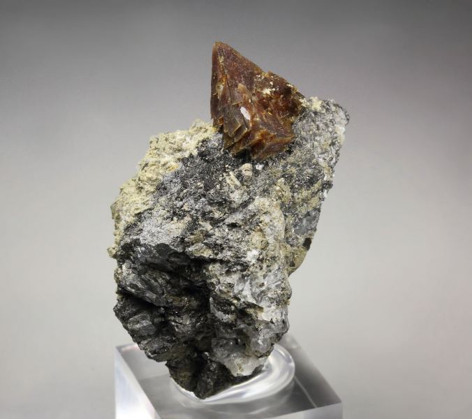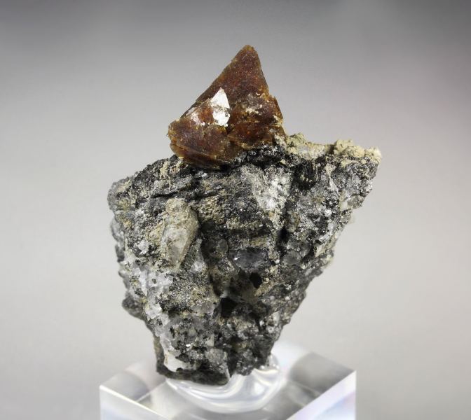 Aesthetic specimen of sharp tetrahedral Helvine crystals from Huanggang Fe-Sn deposit, Inner Mongolia AR, China. The Helvine is an uncommon silicate. The crystals are waxy lustrous with rich brown color. They sit attractively at the top forming an excellent focal point. This cluster is complete all over. Small colorless Calcite crystals, fluorescent in orange and black Magnetite are seen too. In excellent condition. On acrylic base., Choice Helvine!Data last checked on 25th Aug 2021 - specimen may no longer be available