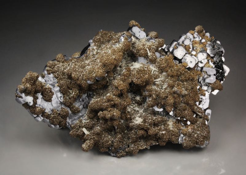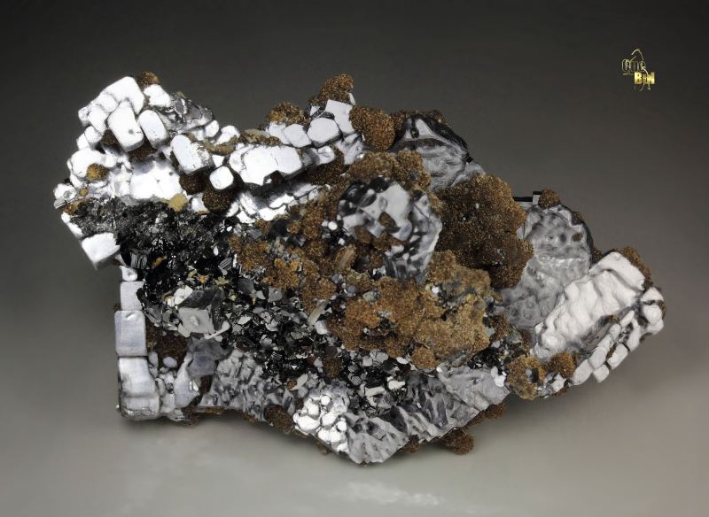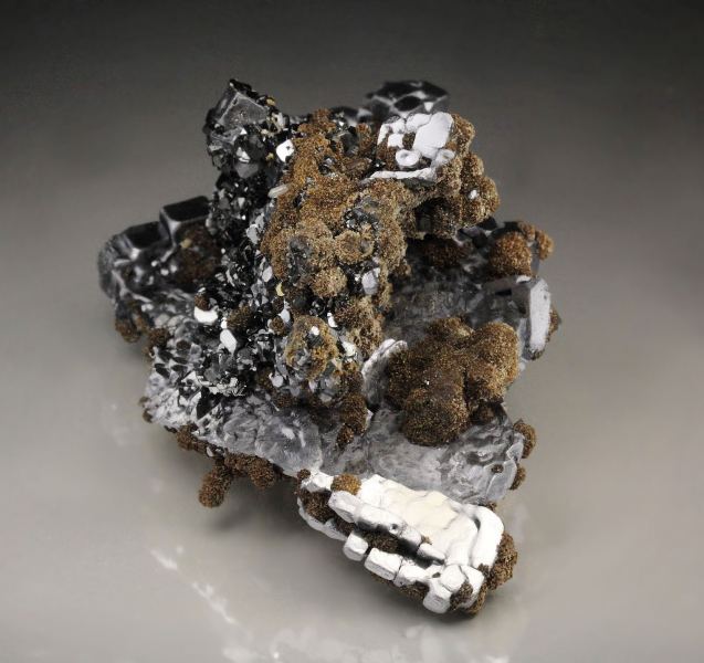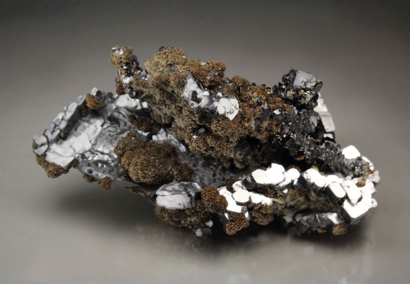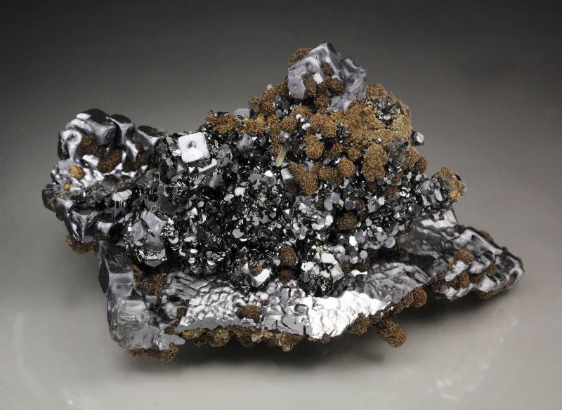 Attractive offbeat specimen of Galena cubes with Sphalerite from the famous Madan ore field, Bulgaria. It presents an aesthetic arrangement of Galena cubes with lustrous faces. They form a super flat plate decorated with one vertical structure. Among them grow small black Sphalerite crystals with strong luster. They are fresh and sparkling. Unidentified brown mineral with micro rosette crystallization gives a nice contrast. It displays from many sides. In very good condition – some nicks and contacts., Neat specimen from this closed mine!Data last checked on 25th Aug 2021 - specimen may no longer be available