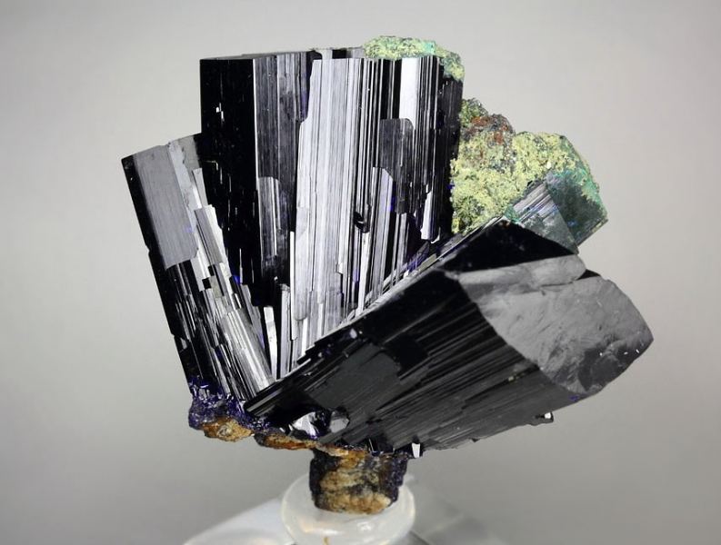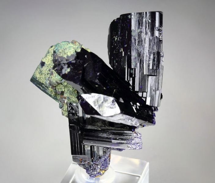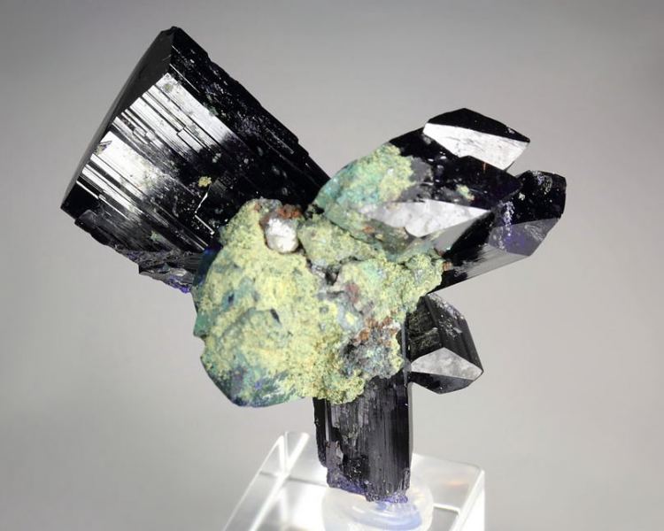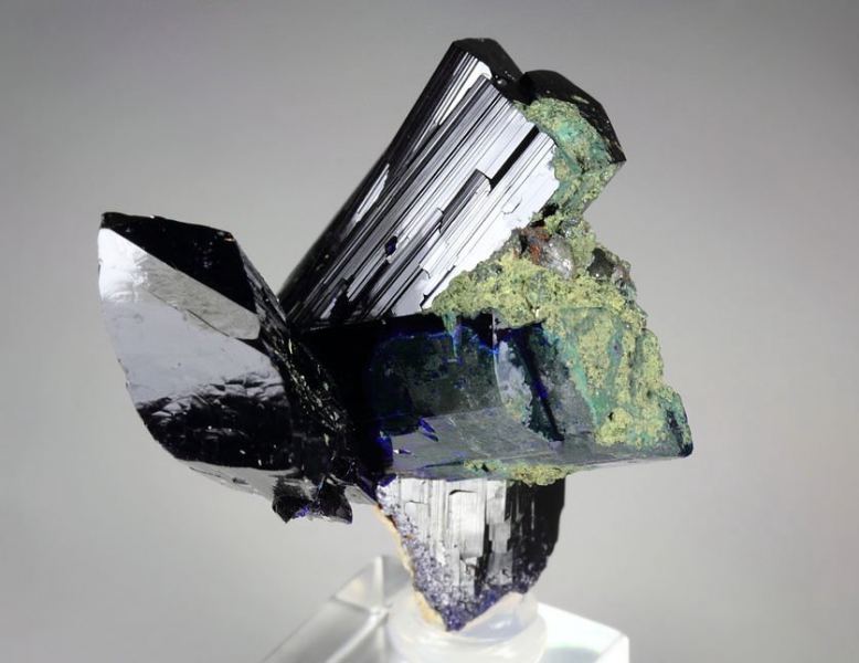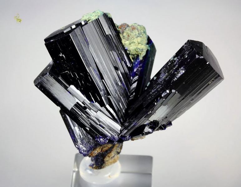 Exceptional top specimen of Azurite from Touissit, Morocco. It displaying spray of Azurite blades forming a beautiful cluster. It has very elegant and three dimensional display. With splendid Azurite blades - very brilliant and extremely lustrous. The color ranges from dark to intense electric royal-blue. On a strong backlight the crystals reveal some splendid gemminess. Some areas have been pseudomorphed by green Malachite. Displays all over 360 degree. For references see the 2013 issue of The Mineralogical Record vol. 44, # 6. In very good condition – some small nicks. On acrylic base., World grade quality Azurite beauty!Data last checked on 25th Aug 2021 - specimen may no longer be available