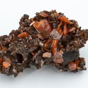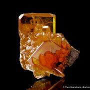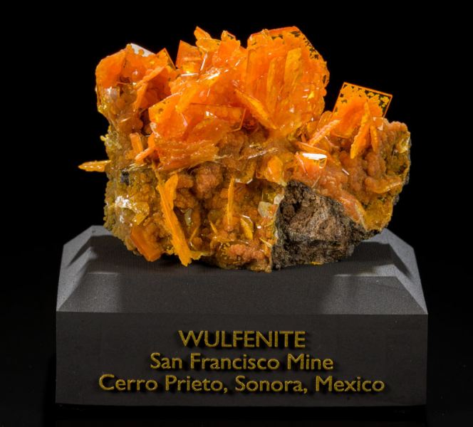 The color of this Wulfenite specimen is quite exceptional! Most of these are a paler, yellower shade of orange, but this one is a pure, saturated orange color, so it really stands out when compared to others from this mine. There is Mimetite growing on the matrix and on the Wulfenite blades, and when this piece is placed in a display case under a spotlight it lights up with a such a strong color that your eye is immediately attracted to it! This is a very old piece from an old collection that hasn't seen the light of day in decades (probably the 1970's). Condition is typical for a dense Wulfenite like this, so it has numerous broken blades, but you have to look pretty close for it to matter because this piece is all about the color. Data last checked on 14th Sep 2021 - specimen may no longer be available