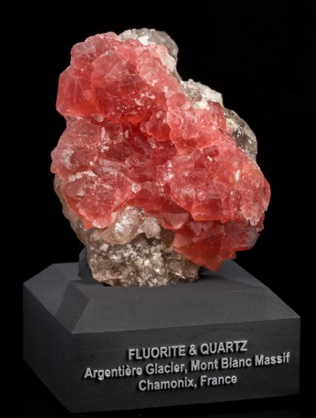 A beautiful red fluorite specimen from Mont Blanc in France. The red fluorite almost completeyl covers the front side of the quartz matrix. The largest fluorite crystal measures 1.6cm on edge. Condition is very nice with no dings to the fluorite face. Data last checked on 14th Sep 2021 - specimen may no longer be available