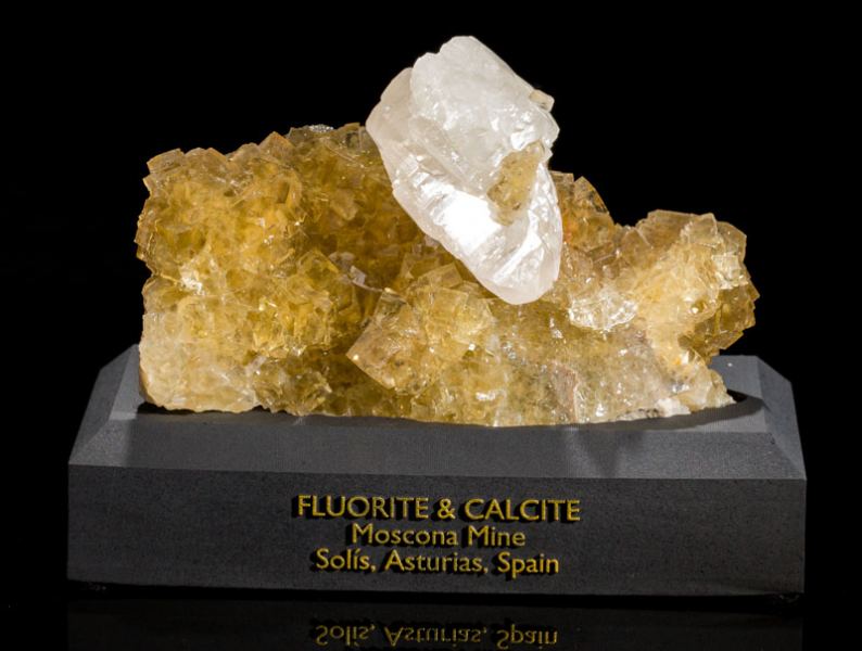 The Moscona Mine in Spain is known for its gemmy, yellow fluorite, and this specimen has the extra bonus of having a beautiful, aesthetically place, calcite crystal right in the middle of it. There are actually two calcite crystals stacked on top of each other, and the bottom one measures 4.2cm long. The fluorite is covering both the front and back of the specimen with crystals in the ~5mm range.Data last checked on 14th Sep 2021 - specimen may no longer be available