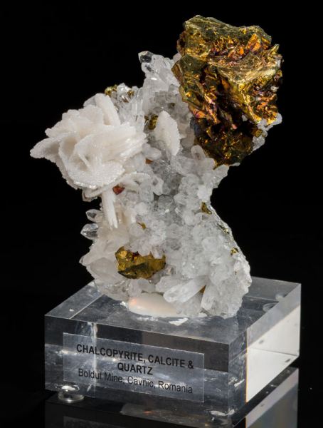 This has got to be one of the most aesthetic Romanian combo specimens we've seen in a long time. The body of the specimen is quartz, and it has growing on ita beautiful calcite rose and large, slightly-iridescent chalcopyrite. This is one of those special pieces that don't come along very often. The condition is excellent with no apparent damage to the calcite rose, the quartz crystals or the chalcopyrite.Data last checked on 14th Sep 2021 - specimen may no longer be available