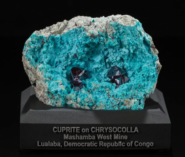 This specimen has great contrast with the dark, dark red cuprite crystals on the blue chrysocolla. There are actually 8 cuprite crystals here, but they are grouped into two clusters of four each. The largest crystal measures about 8.5mm wide. Data last checked on 14th Sep 2021 - specimen may no longer be available