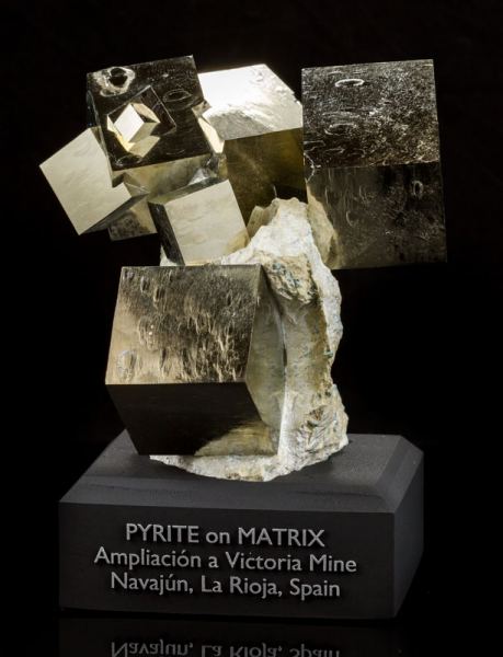 This is an exceptional, large pyrite cube cluster on matrix! There are 9 high-quality pyrite cubes, some intergrown and perched on the matrix. The largest cube is 4cm long. Great aesthetics, and it comes on a custom Greenstone Mineral Base. Data last checked on 14th Sep 2021 - specimen may no longer be available