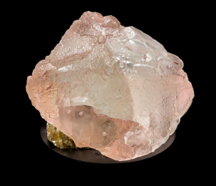 Gem-quality pink Fluorite with a Muscovite accent. Here is a single octahedral fluorite crystal with some fantastic stepped growth patterns on the faces. It is a wonderful shade of peach-pink and has just a hint of green in the core. Aesthetically located on the bottom-left of the specimen is a small patch of Muscovite. The fluorite crystal is in exceptional condition all the way around. There is just the contact point on the bottom. Some of the larger steps on the faces provide little windows into the core, and it is glass-clear! This is a very fine, high-quality example of fluorite from this location. Data last checked on 14th Sep 2021 - specimen may no longer be available