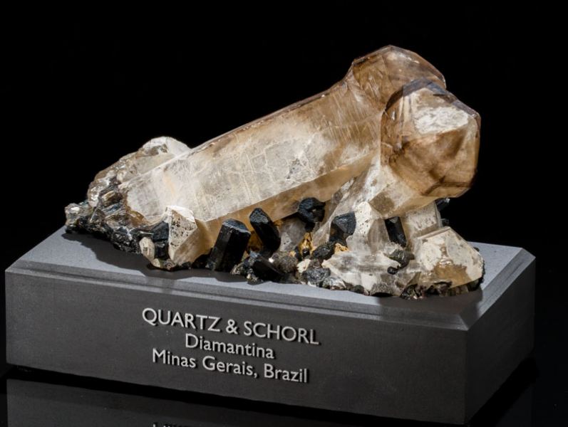 An insanely aesthetic combo specimen that has two overlapping Scepter Quartz crystals on a bed of Schorl Black Tourmaline. This is really an amazing find! The two scepters have visible phantoms as the outer shell is clear and the inner core is more opaque. It is almost a floater because the entire bottom side is crystallize as well. Condition is quite good. Only noticeable damage is where there was probably once a third scepter crystal on the left side that broke off at the base. Data last checked on 14th Sep 2021 - specimen may no longer be available