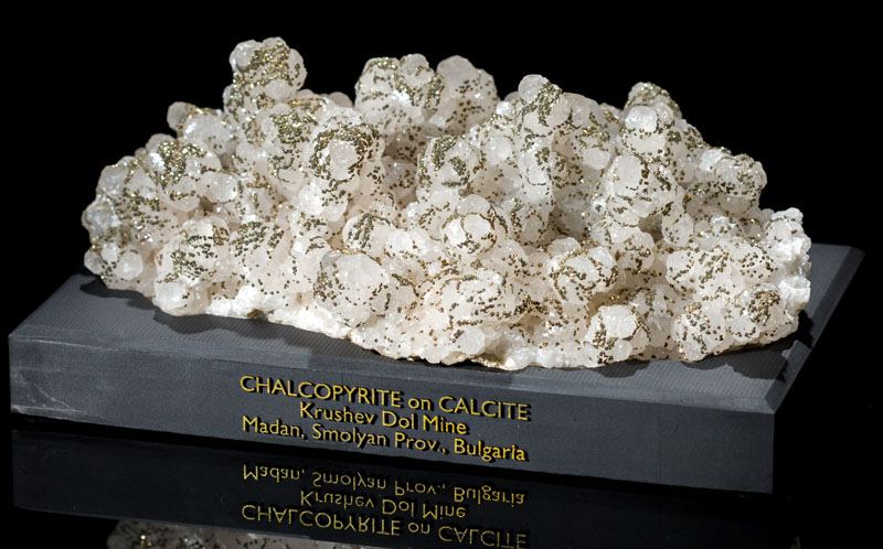 What the photos don't capture is how glittery and sparkly this specimen is. The chalcopyrite actually looks like golden glitter spread over the calcite crystals. The specimen is in excellent condition with no damage other than the areas around the edge where it was trimmed. A very aesthetic and showy find! Data last checked on 14th Sep 2021 - specimen may no longer be available