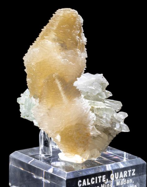 A beautiful double-calcite on quartz from a one-off pocket at the Borieva Mine in Bulgaria! This pocket was discovered in late July of 2017. There are two large calcite crystals growing on top of each other forming a curved chain. In back of the calcite crystals is a bed of finger-like quartz crystals with green chlorite inclusions. The scalenohedral calcite crystals are yellow-amber color, and are comprised of hundreds of flattened, stacked rhombohedrons. A highly aesthetic, beautiful, and unique specimen! Very good condition with no significant damage. Data last checked on 14th Sep 2021 - specimen may no longer be available