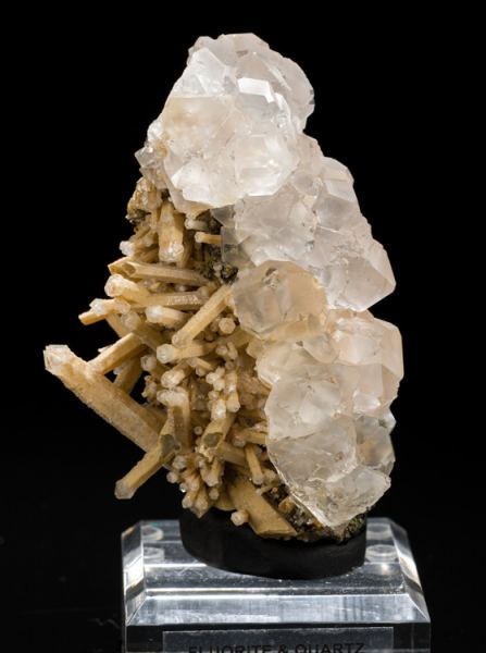 This is an aesthetic combo piece from Dalnegorsk, Russia. On the right side are multiple, colorless, fluorite crystals, and on the left are sceptered quartz crystals. There also appears to be some dolomite or calcite. The fluorite is glass-clear on the interior with mostly frosted faces. A few faces are like glass windows that let you see inside the colorless crystals. The quartz crystals appear to be multi-generational with the long, thin stems covered in a off-white mineral. The quartz crystals on the tips are clear and must have grown later. Data last checked on 14th Sep 2021 - specimen may no longer be available