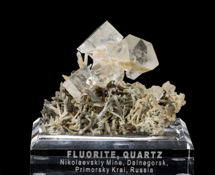 Here is a highly aesthetic fluorite & quartz combo from Dalnegorsk, Russia. The matrix has a bed of fine, pale-green, prasem quartz crystals. Perched atop the quartz is a cluster of 6 intergrown fluorite crystals, and there is one additional fluorite cube off to the right side. The fluorite cubes are up to 2.5cm long, and are completely colorless which is a defining characteristic of Dalnegorsk fluorites. This is fluorite in it's purest form of Calcium Fluoride - the lack of impurities is why it is so clear and colorless. Some of the crystals have a milky white translucency to them while others are clear as glass. Also among the quartz crystal are some unidentified black mineral crystals.Data last checked on 14th Sep 2021 - specimen may no longer be available