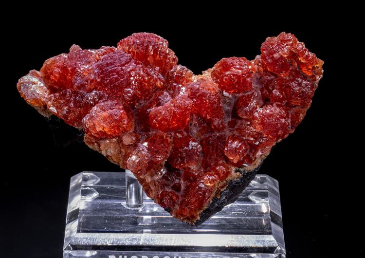 N'chwaning rhodochrosite specimens are the most sought after rhodochrosites in the world and large specimens of good quality are extremely rare. This one is not only an excellent size, but it has the extra benefit of being heart-shaped which is quite approprite for such a red mineral specimen. This is the wheat sheaf habit of rhodochrosite crystals, and they're growing on a matrix of black manganite. There are also black manganite specks mixed in with the rhodochrosite, and also some quartz deep in the crevices between the individual rhodochorisite crystals. Data last checked on 14th Sep 2021 - specimen may no longer be available