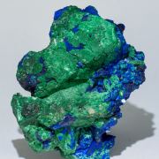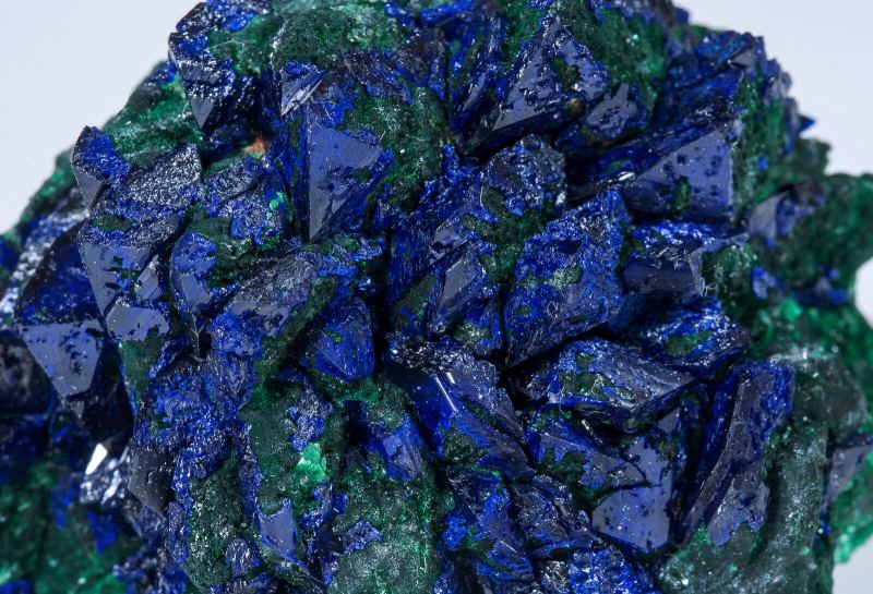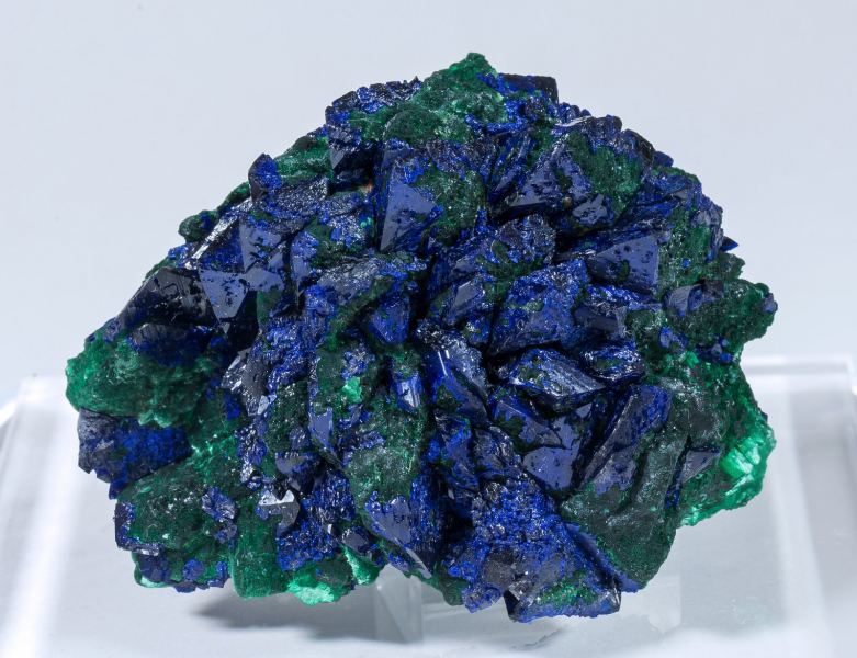 Druse of lenticular Azurite crystals, with bright luster and a vivid and uniform color, partially covered by acicular Malachite crystals. This very characteristic specimen comes from one of the great classic American localities for the species.Morenci, Copper Mountain District, Shannon Mountains, Greenlee County, Arizona USA