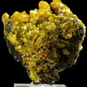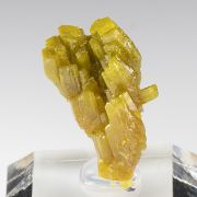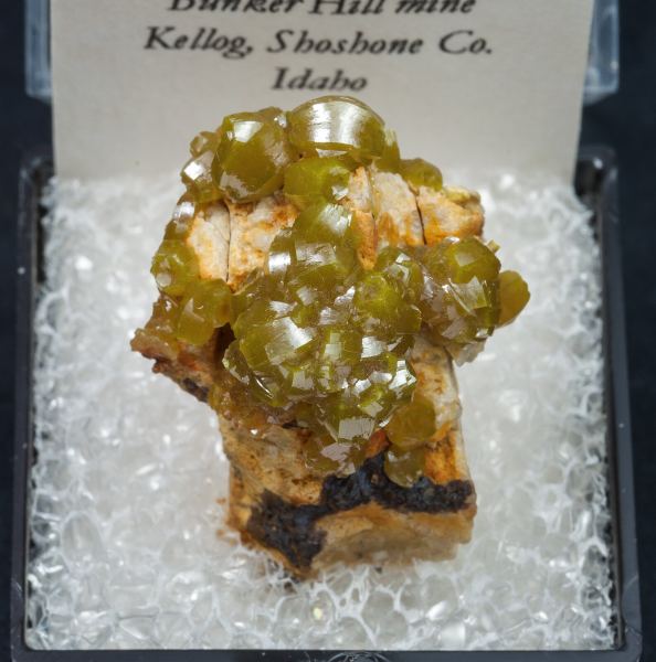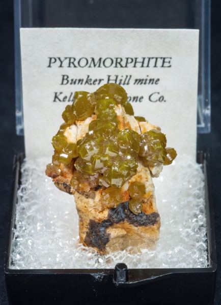 Pyromorphite crystals with a rounded habit due to the curved faces and edges, with bright luster and a yellowish green color.We will ship the specimen, from one of the great classic American localities, in its original Perky box from the Robert J. Noble collection, which also contains the label.
