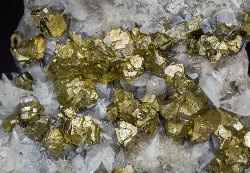 Groups of octahedral Pyrite crystals with minor cube faces. They are very well defined and bright and are on a rocky matrix coated by small, very acute, scalenohedral Calcite crystals, transparent and bright. The sample is from a not well known Iowa mine.Pint's Quarry, Raymond, Black Hawk County, Iowa USA