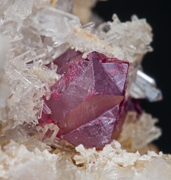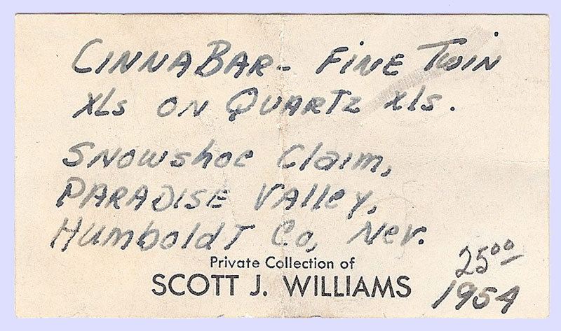 Very sharp rhombohedral Cinnabar crystals with very well defined faces and the interpenetration twin. They have a very vivid color and are on matrix with small Quartz crystals. This specimen has an extraordinary quality for the locality, well known for the species but where good Cinnabars are rare. With label from Scott J. WilliamsSnowshoe Mine, Paradise Valley, Poverty Peak District, Humboldt County, Nevada USA (±1954)