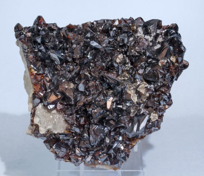 Druse of complex Sphalerite crystals, very rich with faces, clearly twinned and with very well defined forms. They are translucent, very bright, have a very deep color and are on a rocky matrix with small scalenohedral Calcite crystals. An American classic, typical of past samples from the Elmwood mine.Elmwood Mine, Carthage, Central Tennessee Ba-F-Pb-Zn District, Smith County, Tennessee USA