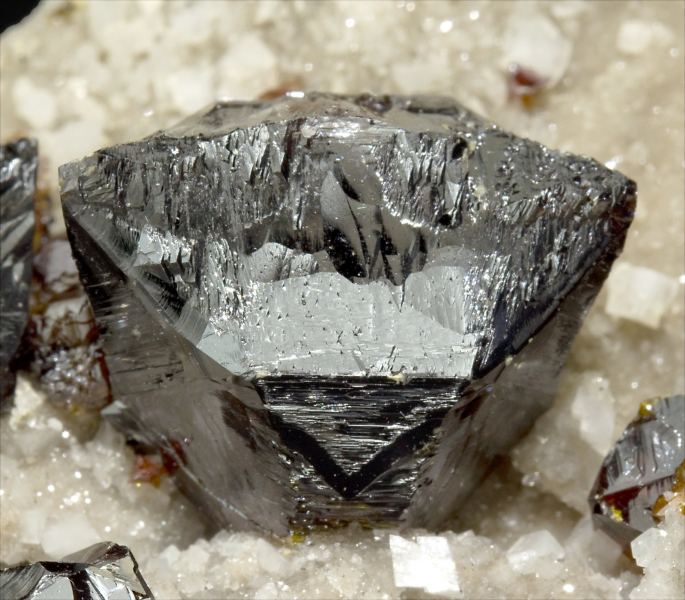 Well individualized crystals with very well defined faces and edges, very bright, and with intense deep red reflections. On matrix, with white rhombohedral crystals of Dolomite.Gordonsville Mine, Carthage, Central Tennessee Ba-F-Pb-Zn District, Smith County, Tennessee USA