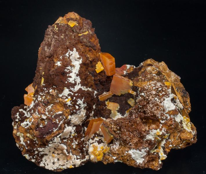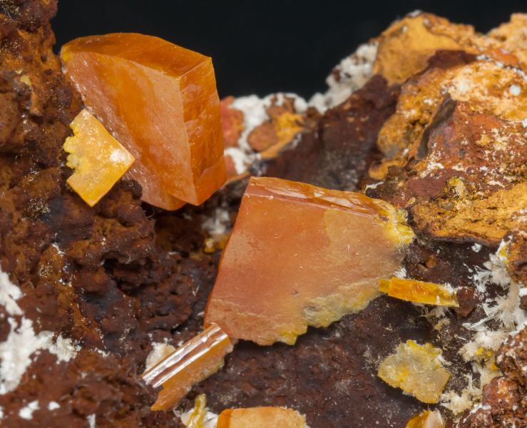 Single tabular Wulfenite crystals that are translucent with an intense orange color and on a limonite matrix partially coated by very fluorescent white Willemite.Los Lamentos Mountain Range, Municipio Ahumada, Chihuahua Mexico